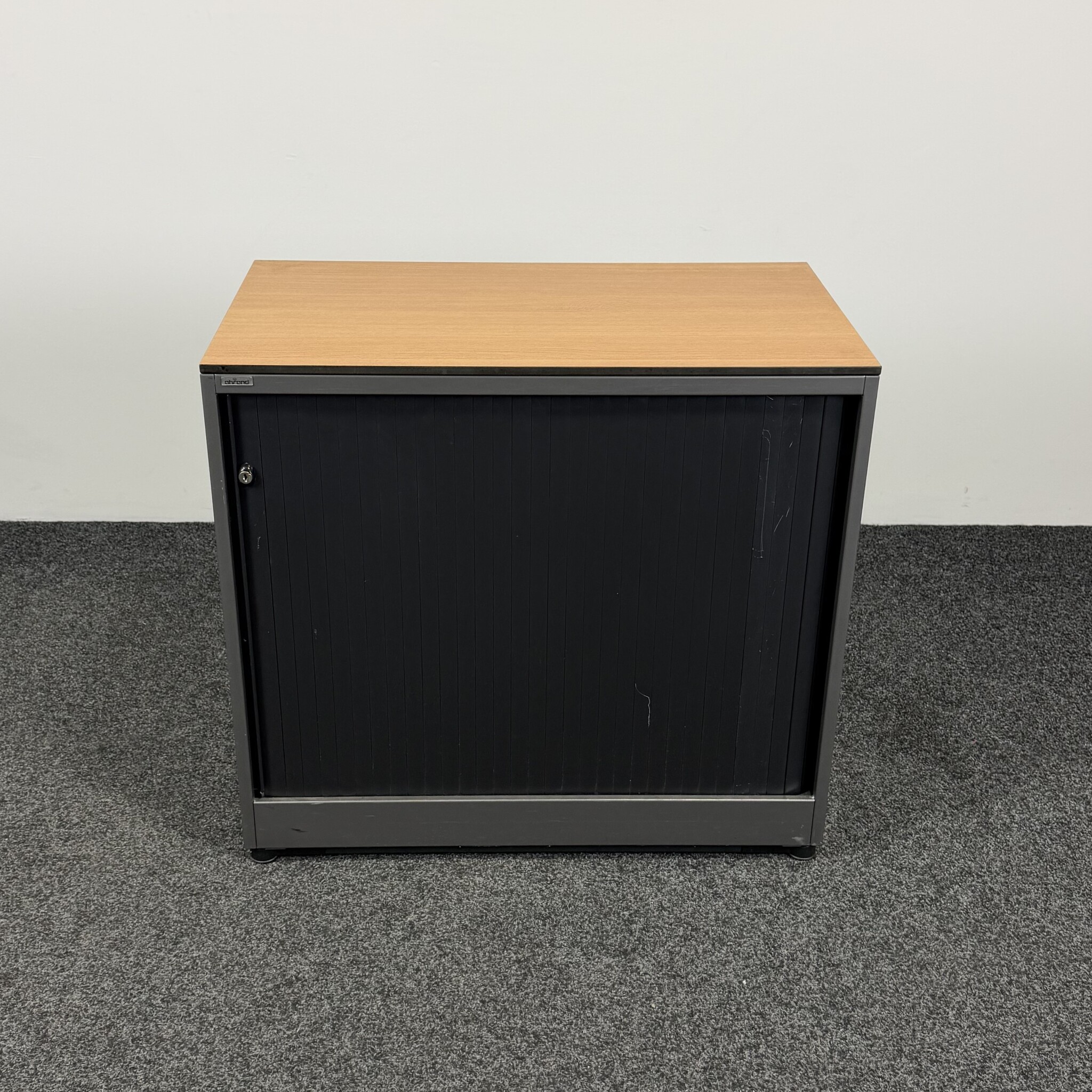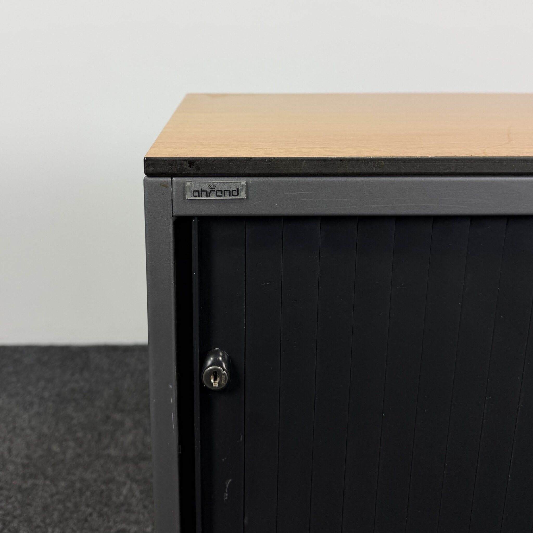 De Ahrend archiefkast is een praktische en compacte opbergoplossing voor kantoor. De kast is uitgevoerd in grijs met een zwarte roldeur en een houten topblad. Voorzien van één in hoogte verstelbaar legbord, ideaal voor het overzichtelijk opbergen van documenten en kantoorbenodigdheden.