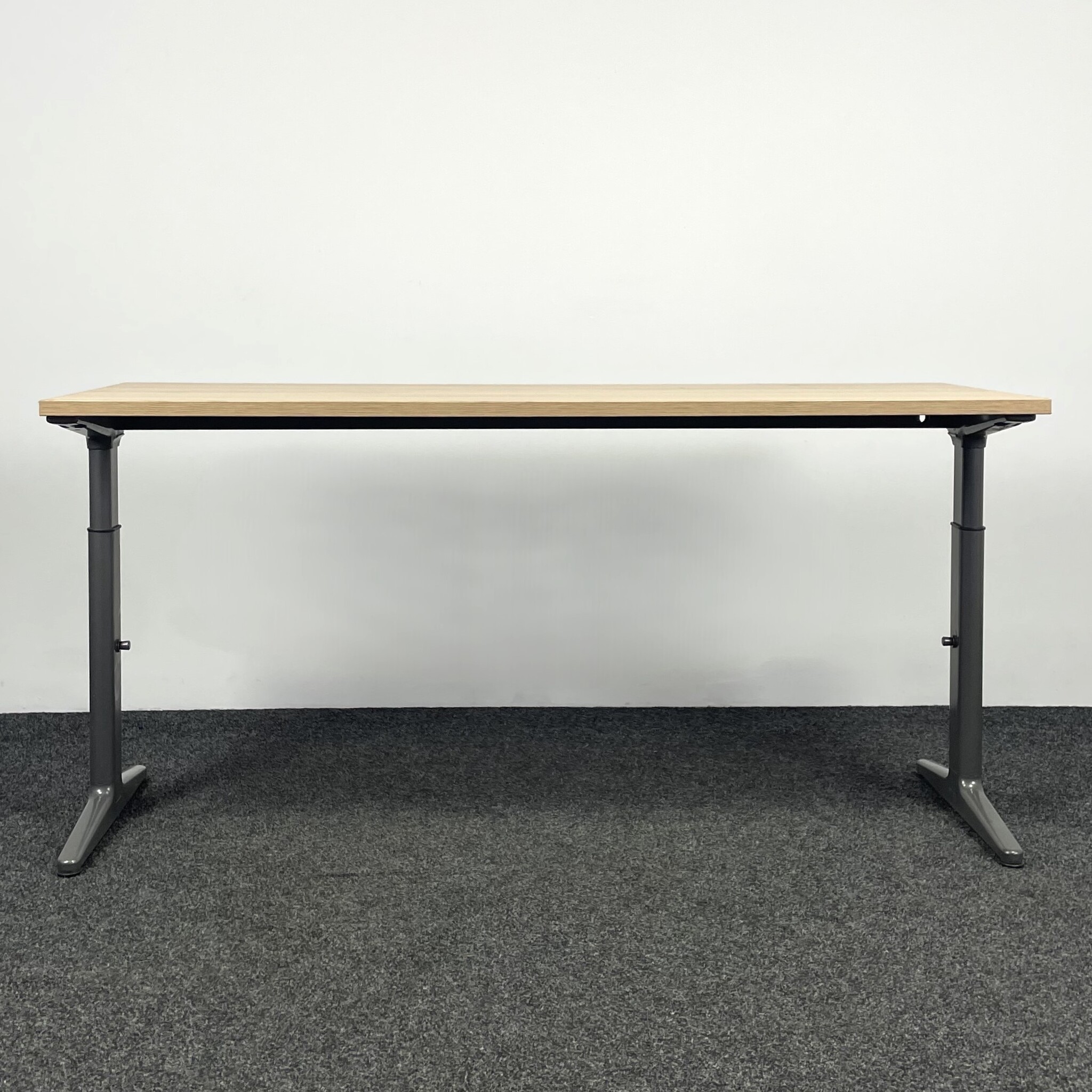 Zeer stevig in hoogte verstelbaar bureau van het merk Ahrend. Dit Ahrend Mehes bureau bestaat uit een gebruikt grijs onderstel met een licht eiken bureaublad. De hoogte is door middel van een knop te verstellen.