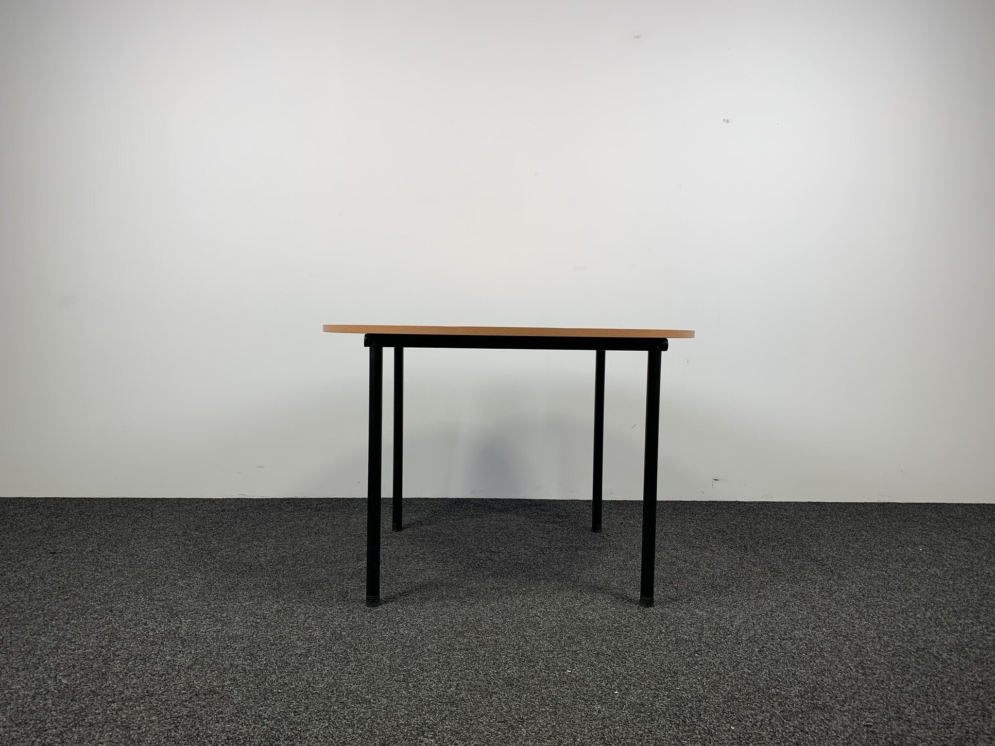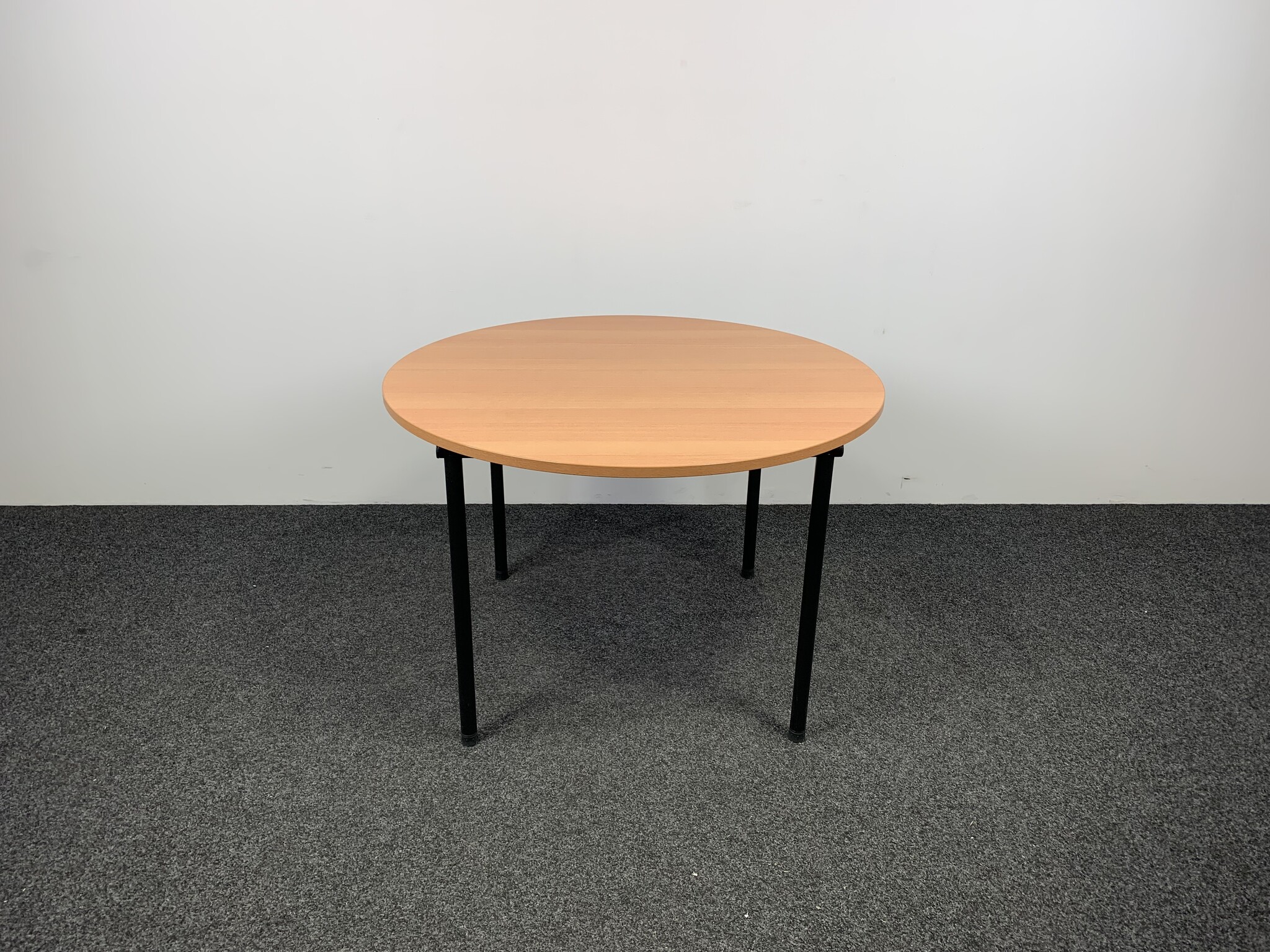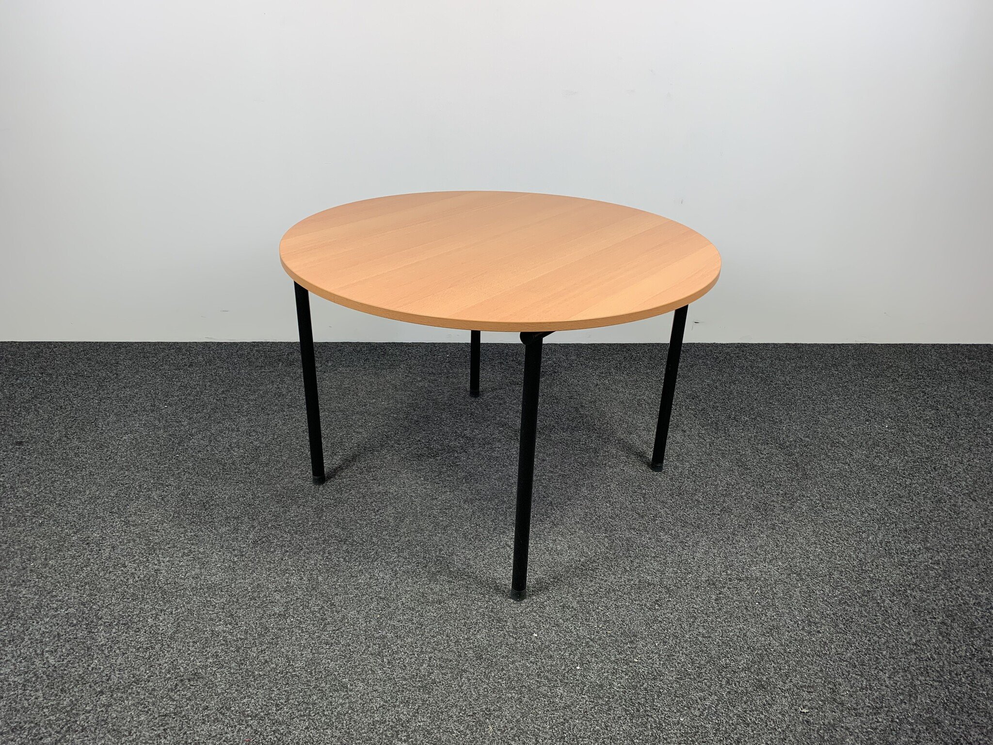 Gebruikte Ahrend vergadertafel tafel. Deze ronde tafel heeft een beuken blad en een 4 poot zwart onderstel en een diameter van 112 cm. Een multifunctionele tafel die te gebruiken is voor diverse doeleinden. Het betreft een gebruikte tafel.