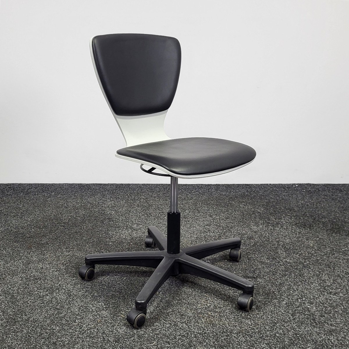 De Ahrend werkstoel in zwart/wit combineert comfort met een tijdloos design. Het zwarte lederen zit- en rugkussen ligt op een houten zitting en rust op een verrijdbaar zwart voetkruis. De stoel is in hoogte verstelbaar van 38 tot 54 cm, waardoor hij flexibel inzetbaar is voor werk- of studieruimtes. Deze gebruikte stoel is een duurzame en stijlvolle oplossing voor kantoor of thuiswerkplek.