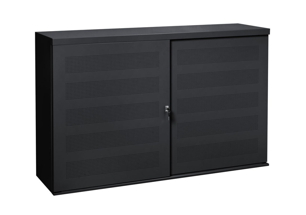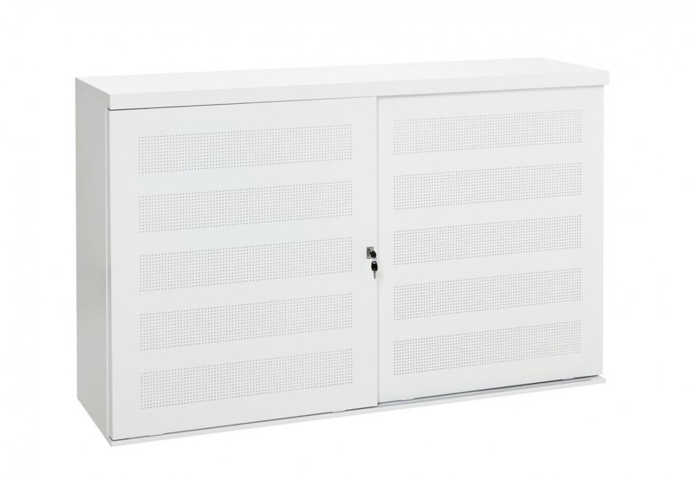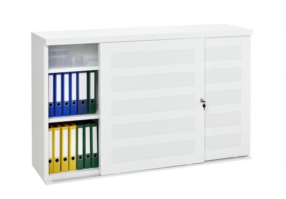 Nieuwe Akoestische schuifdeurkast. De geperforeerde deuren met akoestische vulling absorberen het omgevingsgeluid binnen de werkruimte. Deze kast heeft schuifdeuren die voorzien zijn akoestische foam, achter beide deuren bevinden zich 2 legborden op vaste hoogte.