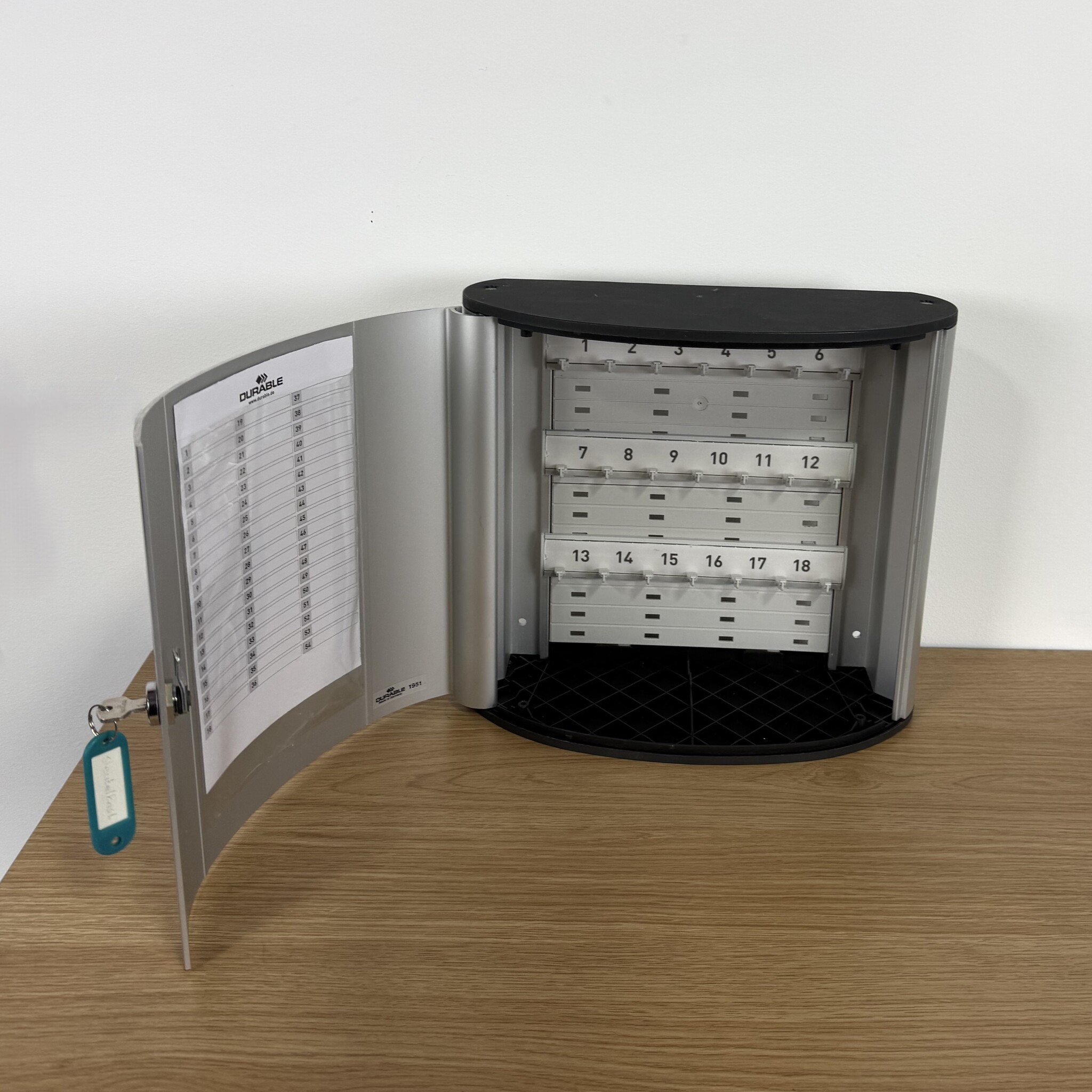 De Sleutelkast / Key Box van het merk Durable met cilinderslot is de perfecte oplossing om je sleutels gemakkelijk en veilig in op te bergen. De kast is gemaakt van robuust aluminium en heeft ruimte voor 18 sleutels.