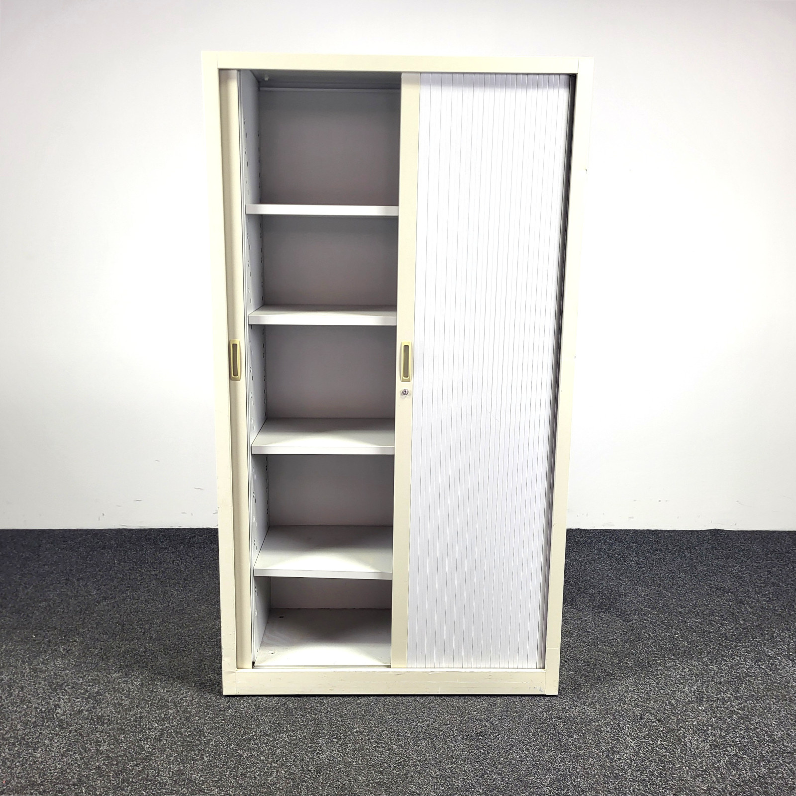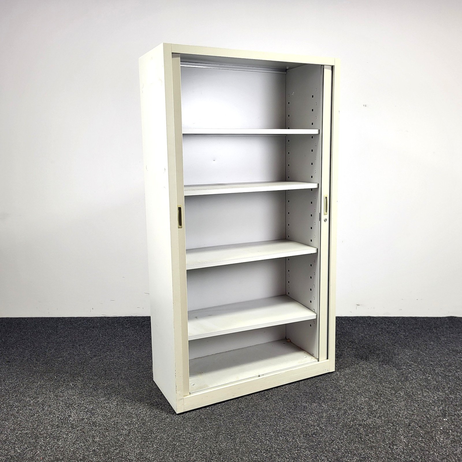 Tweedehands zwarte archiefkast. Het betreft een kast met een crème-kleurige ombouw en witte deuren. De kast heeft 4 legborden die eenvoudig in hoogte verstelbaar zijn. De kast bevat enkele gebruikssporen.