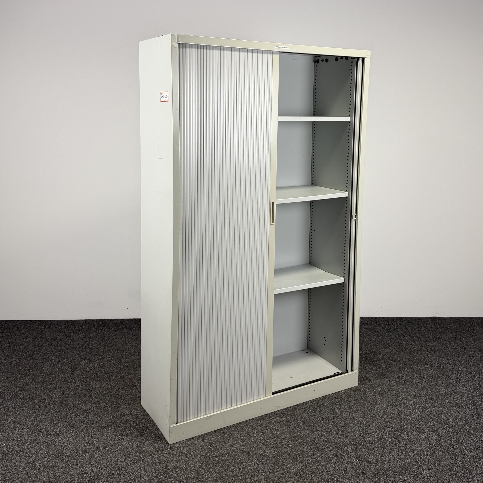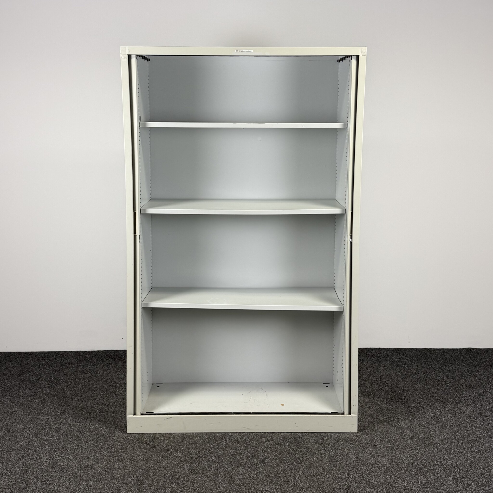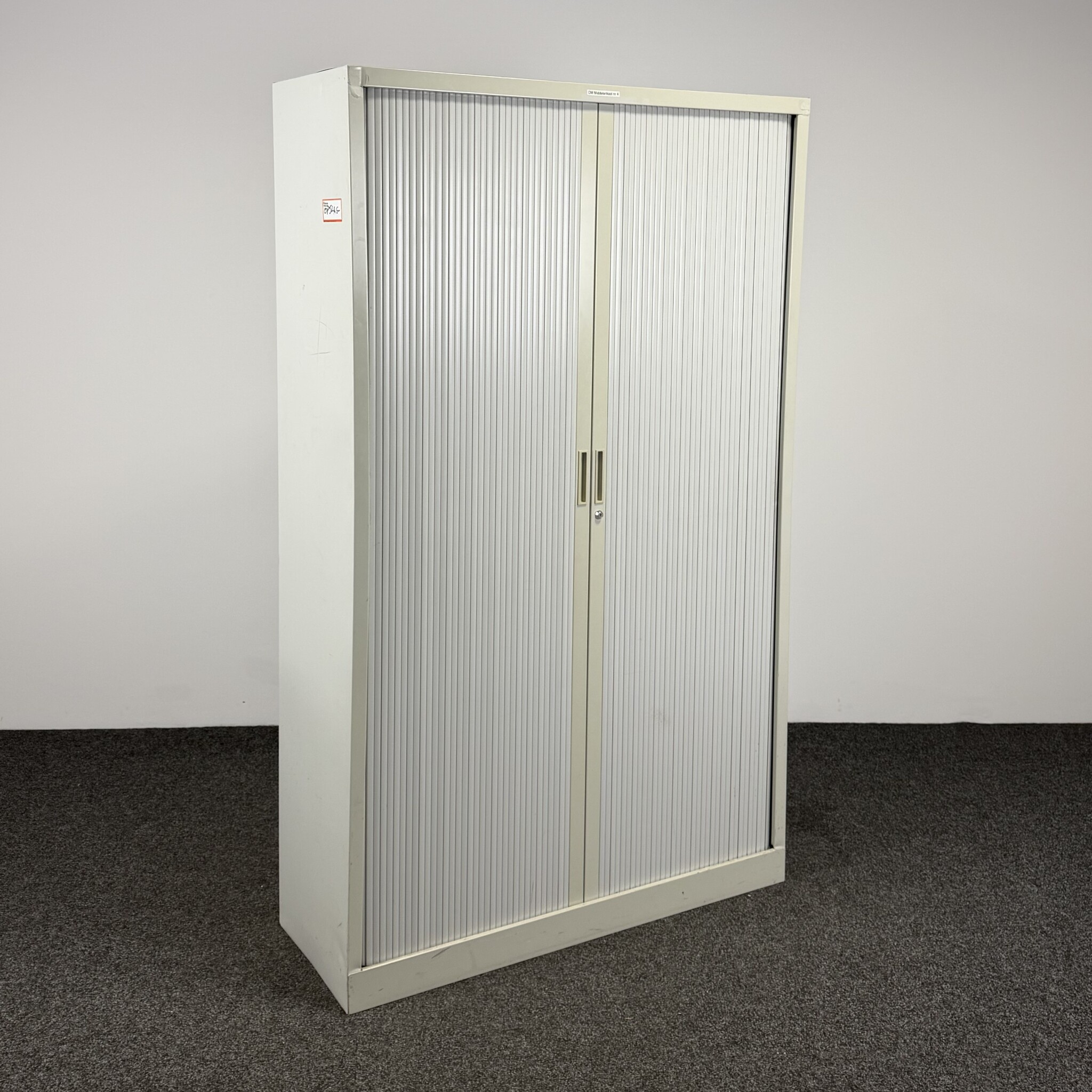 Gebruikte lichtgrijze archiefkast. Deze archiefkast heeft een stalen ombouw, kunststof deuren, 3 legborden die in hoogte verstelbaar zijn.