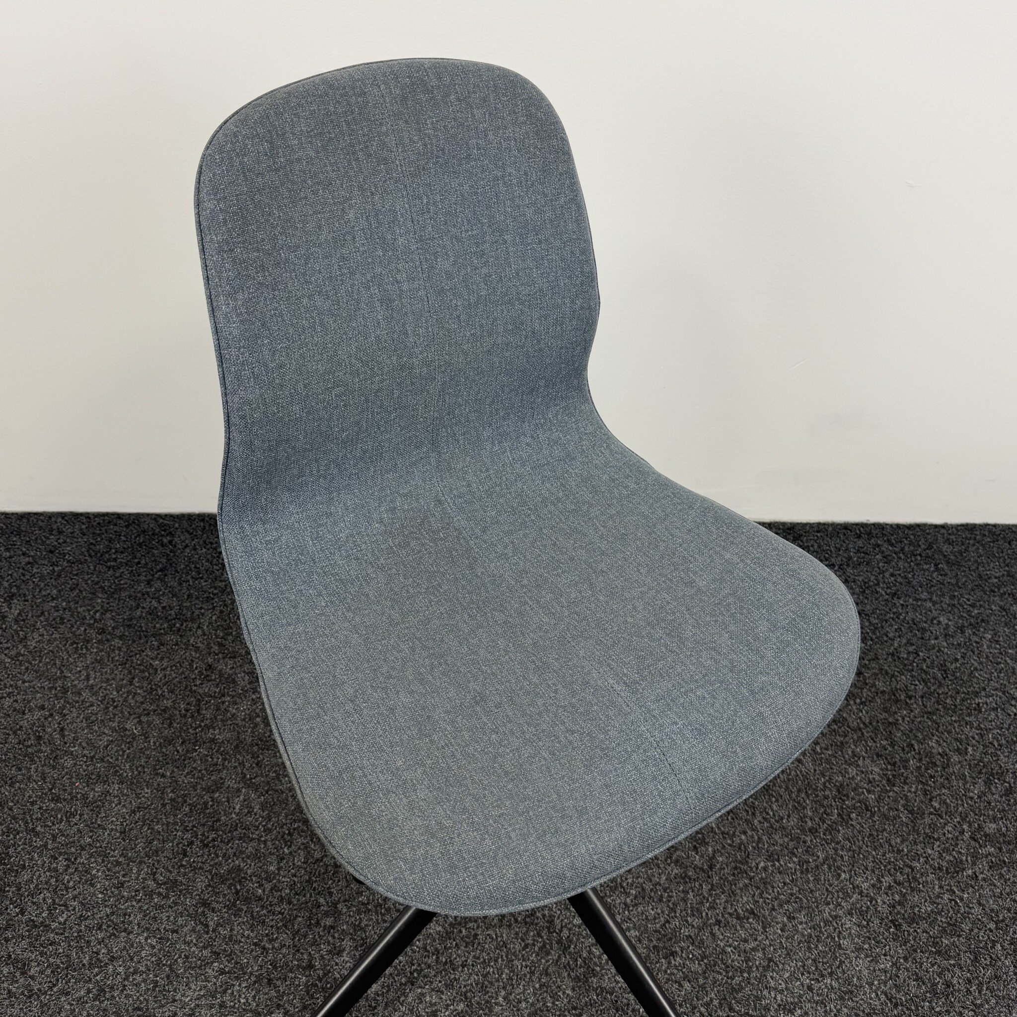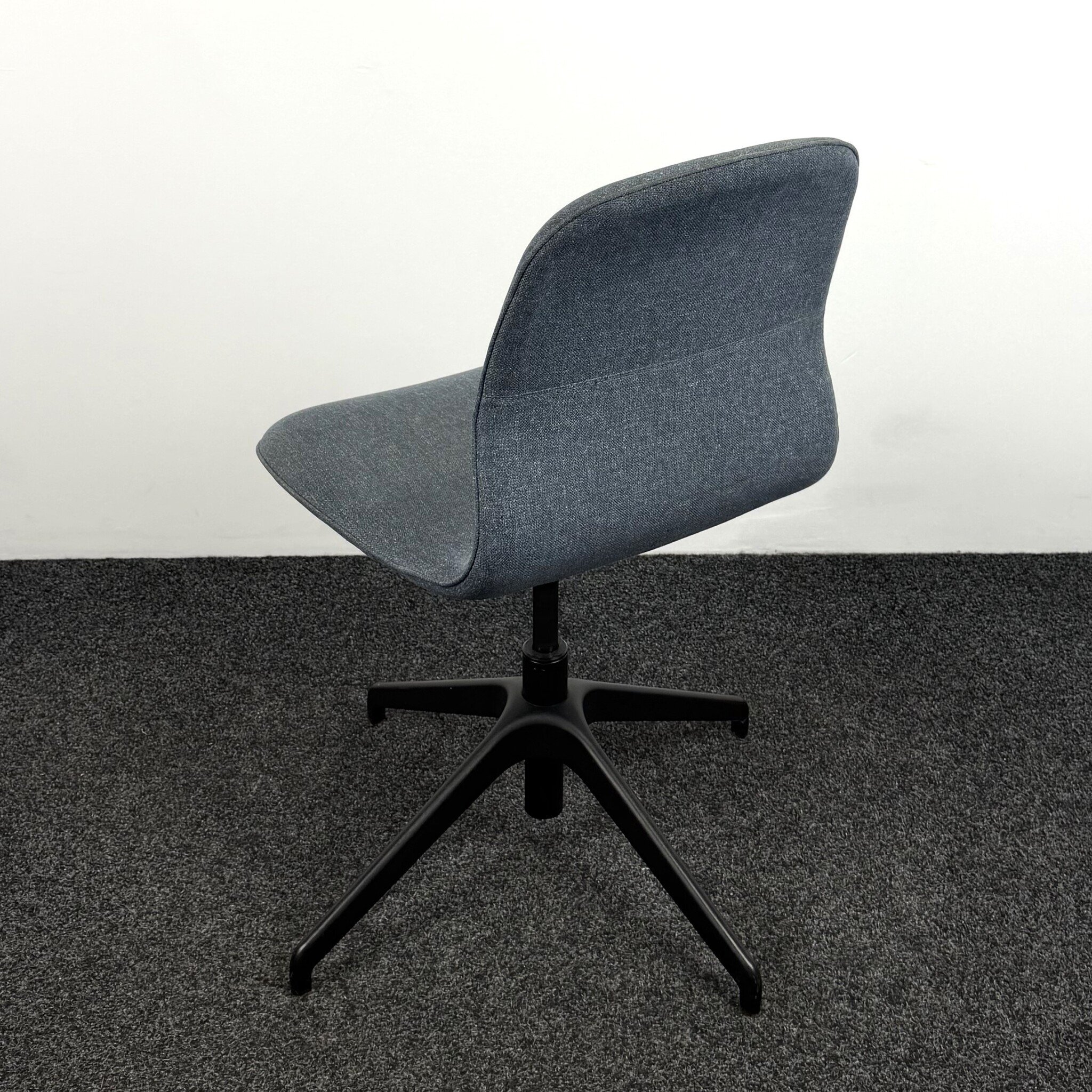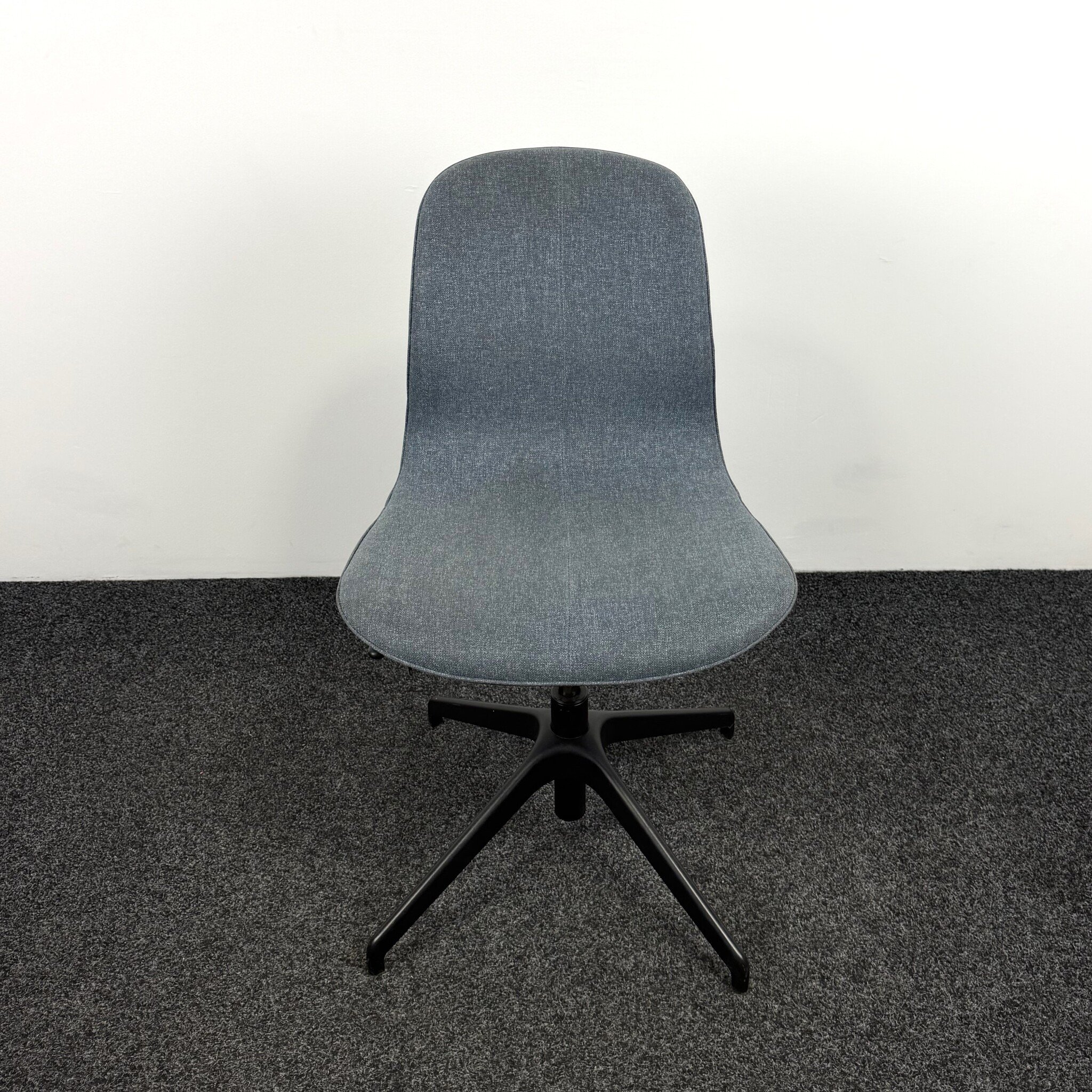 Gebruikte stoel met een comfortabele denim zitting en een zwart onderstel. Deze stoel is draaibaar en eenvoudig in hoogte verstelbaar. Een echte multifunctionele en stijlvolle stoel!