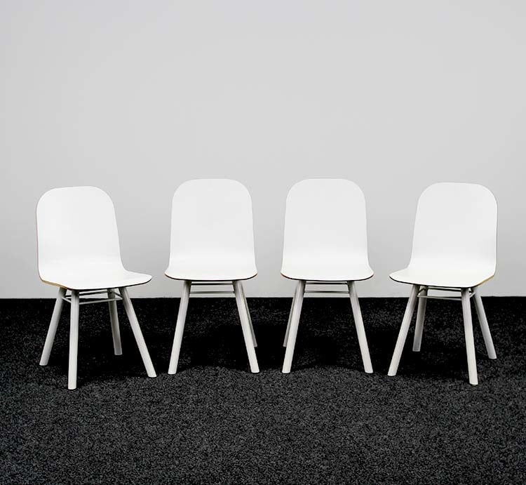 Set van 4 Huislijn Carvi designstoelen, geheel uitgevoerd in witte kleurstelling. Dit betreft een set die afkomstig is uit onze showroom, mogelijk zeer lichte gebruikssporen zichtbaar.
