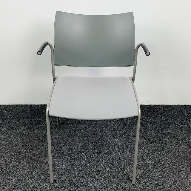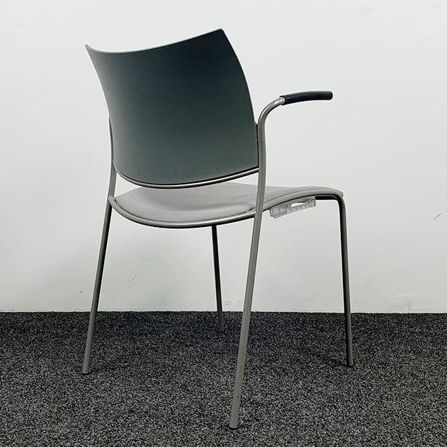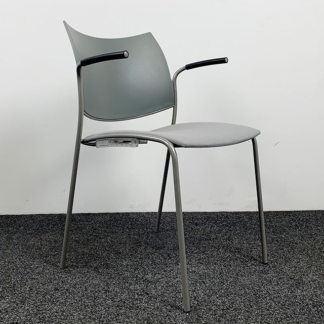 Gebruikte kantinestoel van het merk Casala. Deze stoel heeft een 4 poot onderstel, vaste armleggers, een stoffen zitting en een kunststof rugleuning. De stoel heeft gebruikssporen.