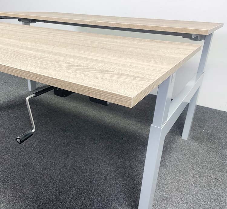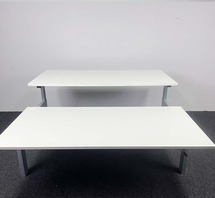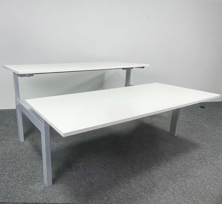 Vepa Edge Basic duo-werkplek. Dit dubbele bureau beschikt over 2 witte bureaubladen van 180×80 cm, en een grijs onderstel. Beide werkplekken zijn individueel in hoogte verstelbaar, van 62 centimeter tot en met 86 centimeter.