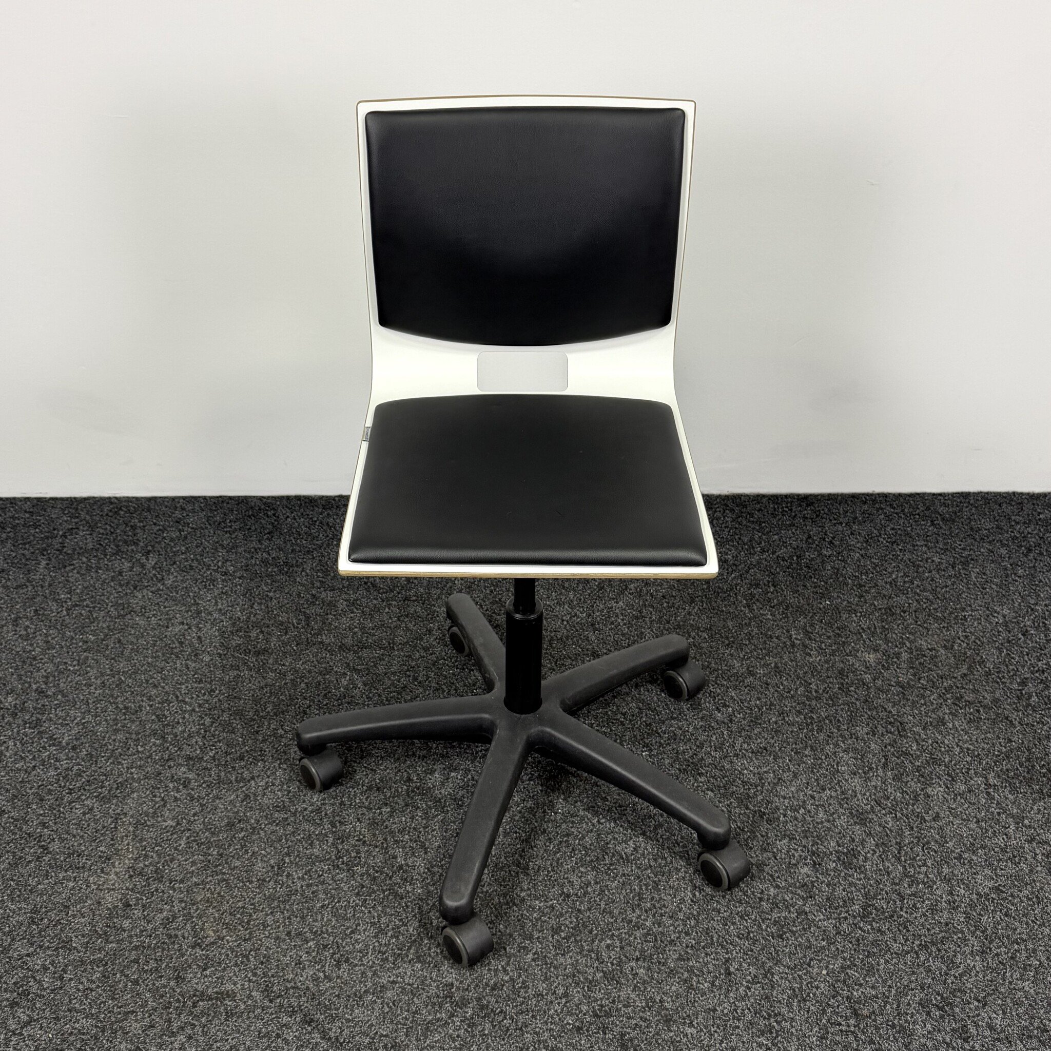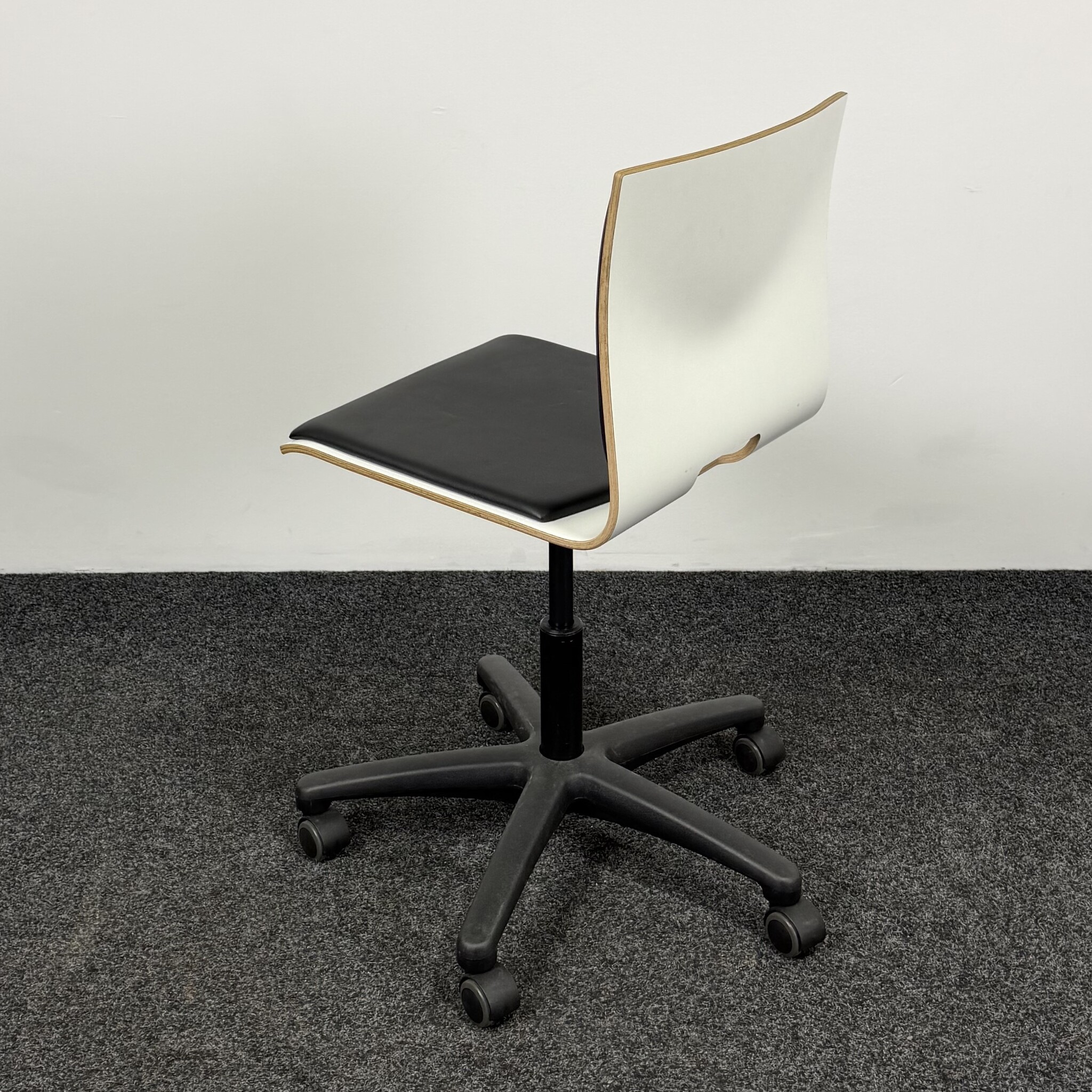De EromesMarko Kiva werkstoel in wit/zwart combineert stijl en comfort voor kantoor, vergaderruimte of thuiswerkplek. De stoel heeft een houten zitting met zwart lederen zit- en rugkussen en staat op een verrijdbaar zwart voetkruis. Dankzij de verstelbare zithoogte van 42 tot 56 cm is de stoel flexibel aan te passen voor iedere gebruiker.