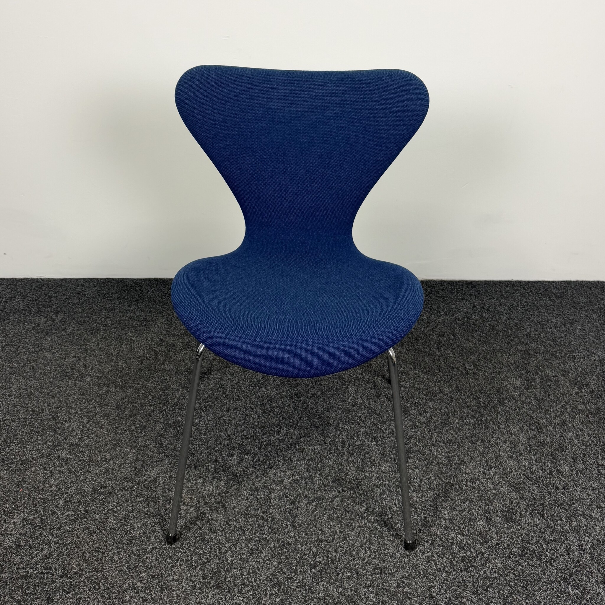 Gebruikte blauwe stoel van het merk Fritz Hansen. Deze stoel heeft een vlindervormige rugleuning en een chroom 4-poot onderstel en is stapelbaar.