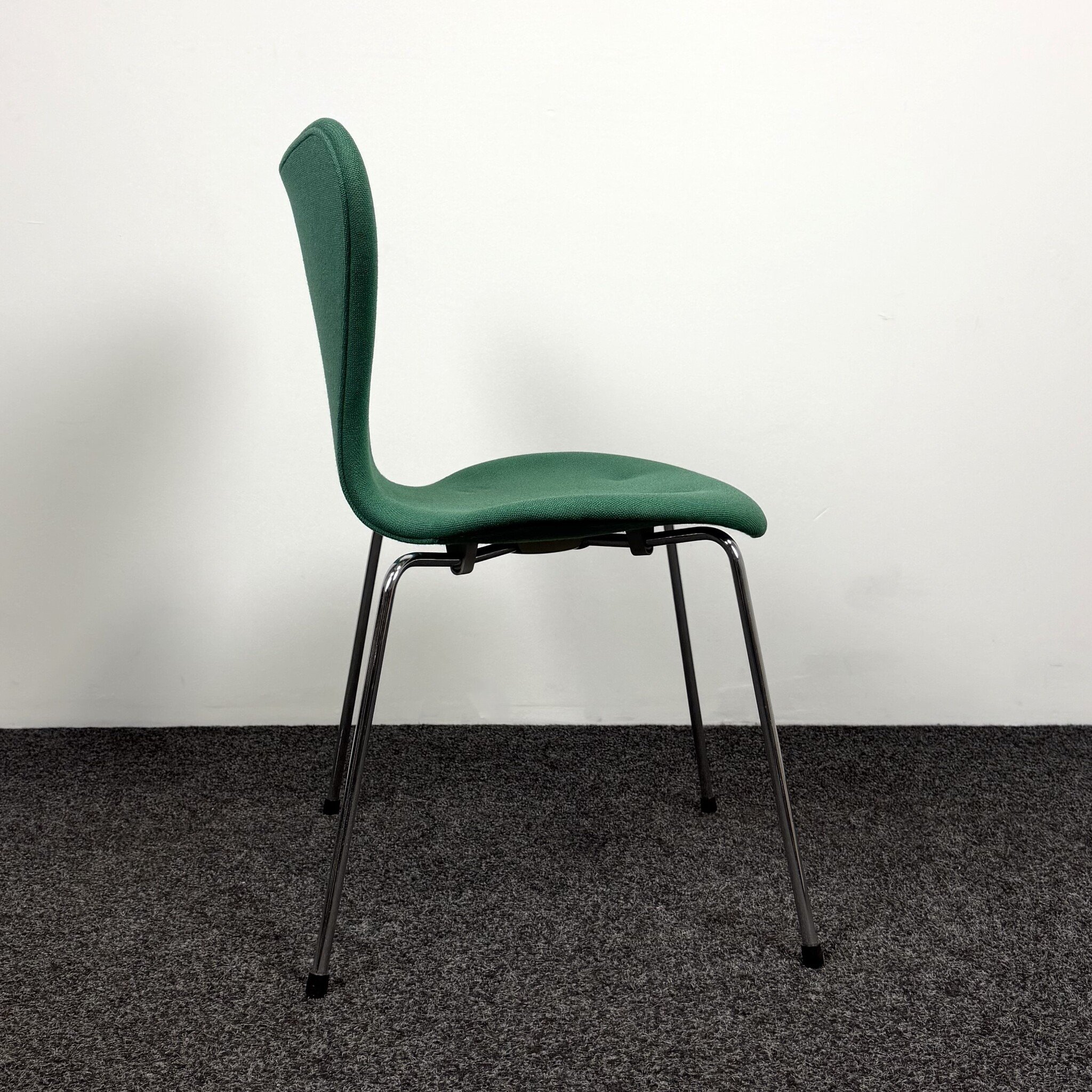 Gebruikte groene stoel van het merk Fritz Hansen. Deze stoel heeft een vlindervormige rugleuning en een chroom 4-poot onderstel en is stapelbaar.