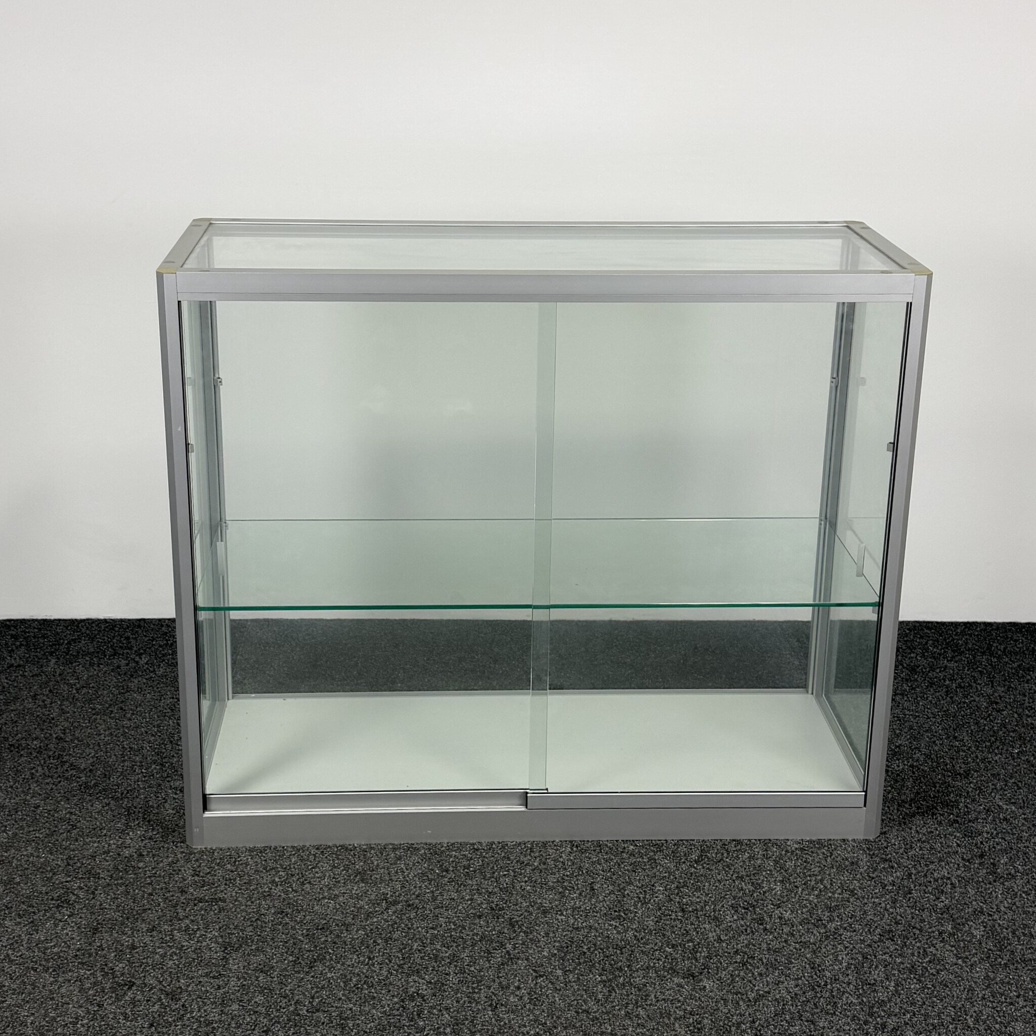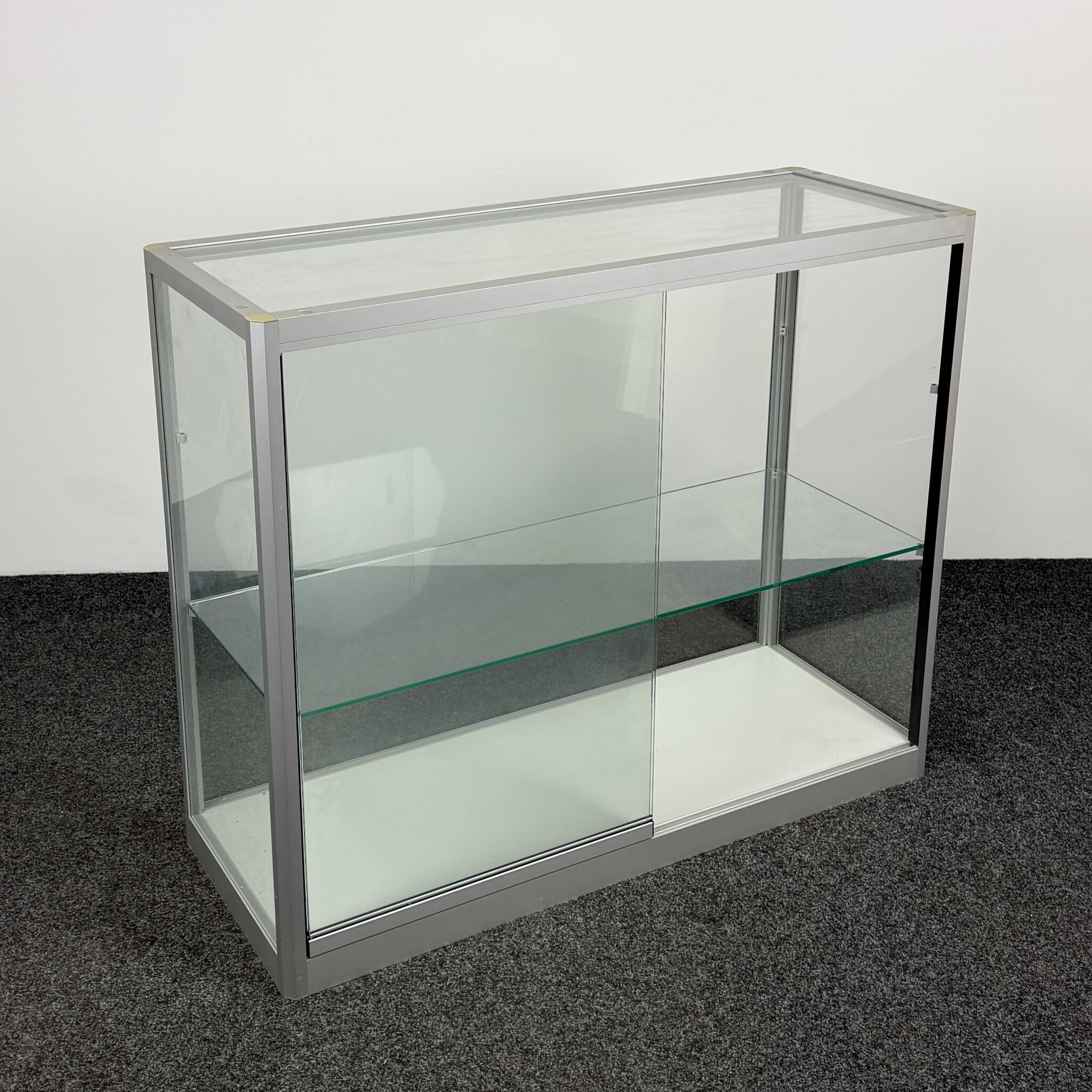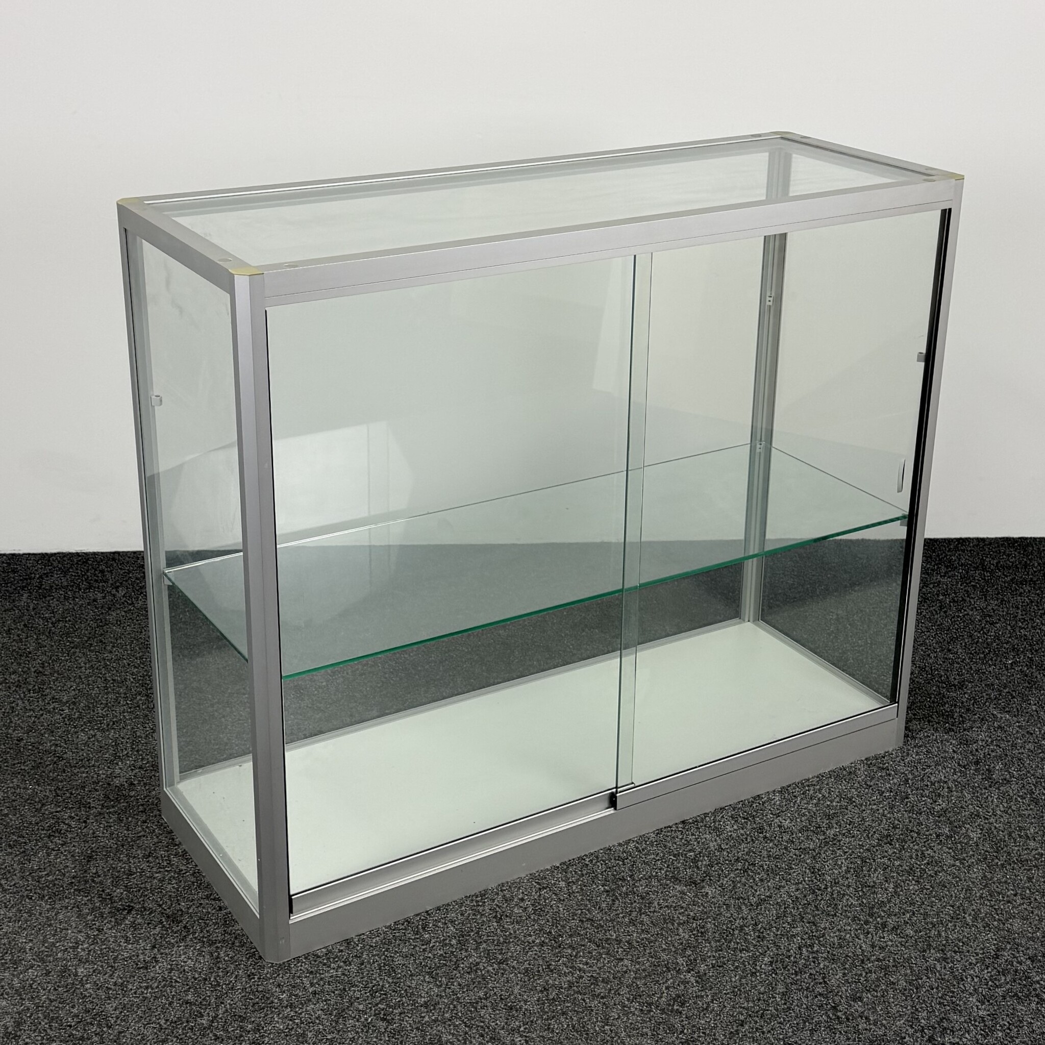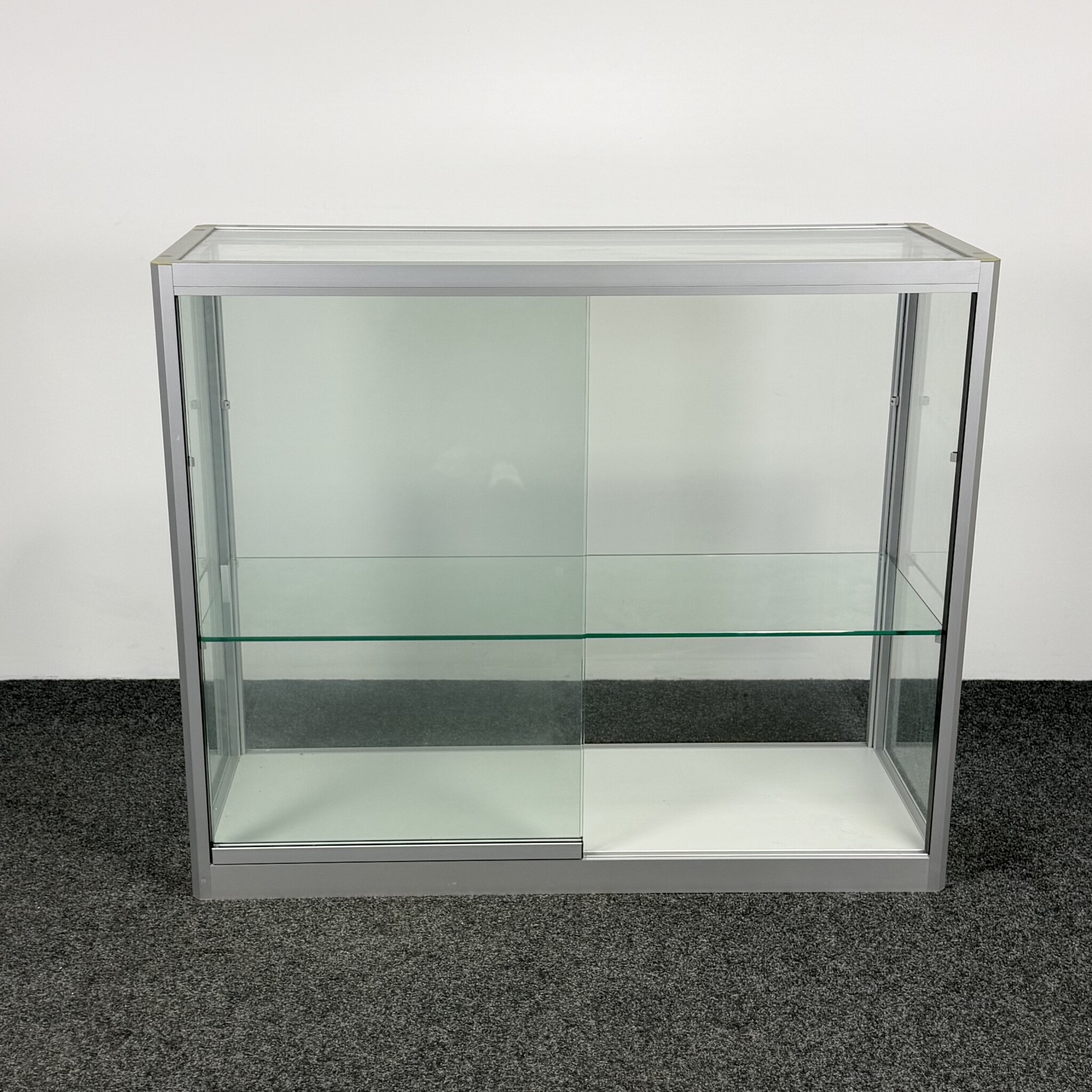 Deze glazen vitrinekast met aluminium randen is ideaal voor het stijlvol presenteren of opbergen van items. De kast heeft twee glazen schuifdeuren en twee niveaus door middel van één legbord. Dankzij het strakke ontwerp en de stevige constructie is deze gebruikte kast geschikt voor kantoor, showroom of ontvangstruimte.
