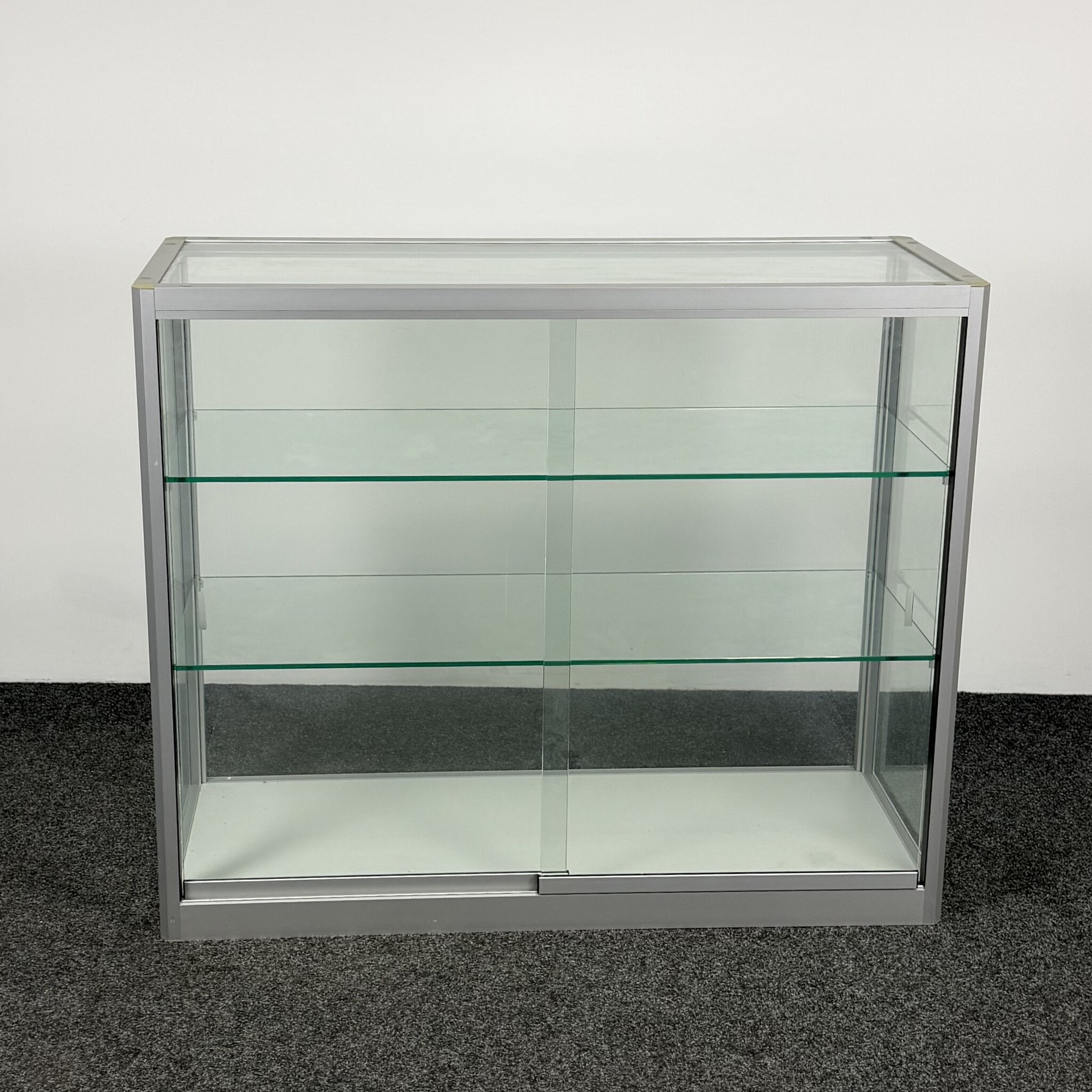Deze glazen vitrinekast met aluminium randen is ideaal voor het stijlvol presenteren of opbergen van items. De kast heeft twee glazen schuifdeuren en drie niveaus door middel van twee legborden. Dankzij het strakke ontwerp en de stevige constructie is deze gebruikte kast geschikt voor kantoor, showroom of ontvangstruimte.