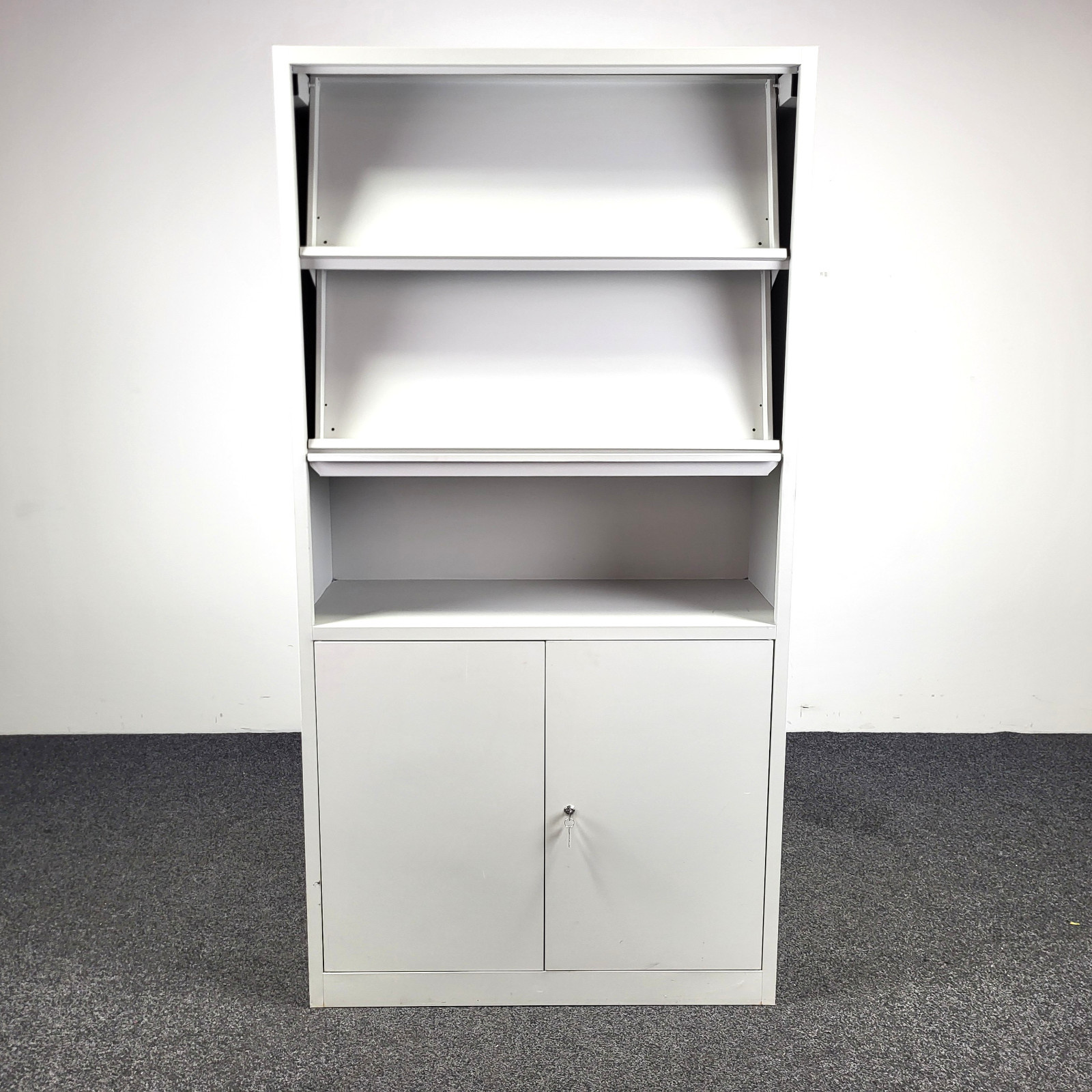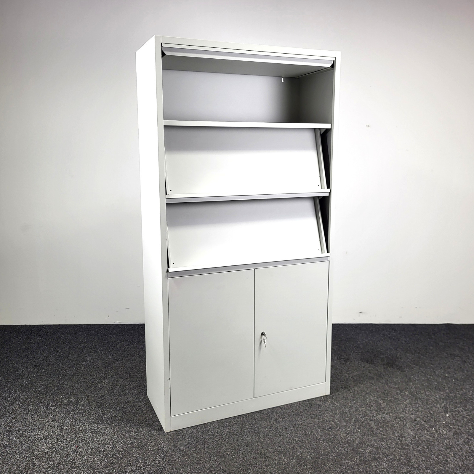 Gebruikte Metalen Tijdschrift- of Folderkast. Deze kast is grijs, is uitgerust met een display op 3 niveaus, handige klep, opklapbaar en een onderkast met legbord. Voorraad is op te bergen achter de klep zo heeft u alles overzichtelijk en netjes weggewerkt.