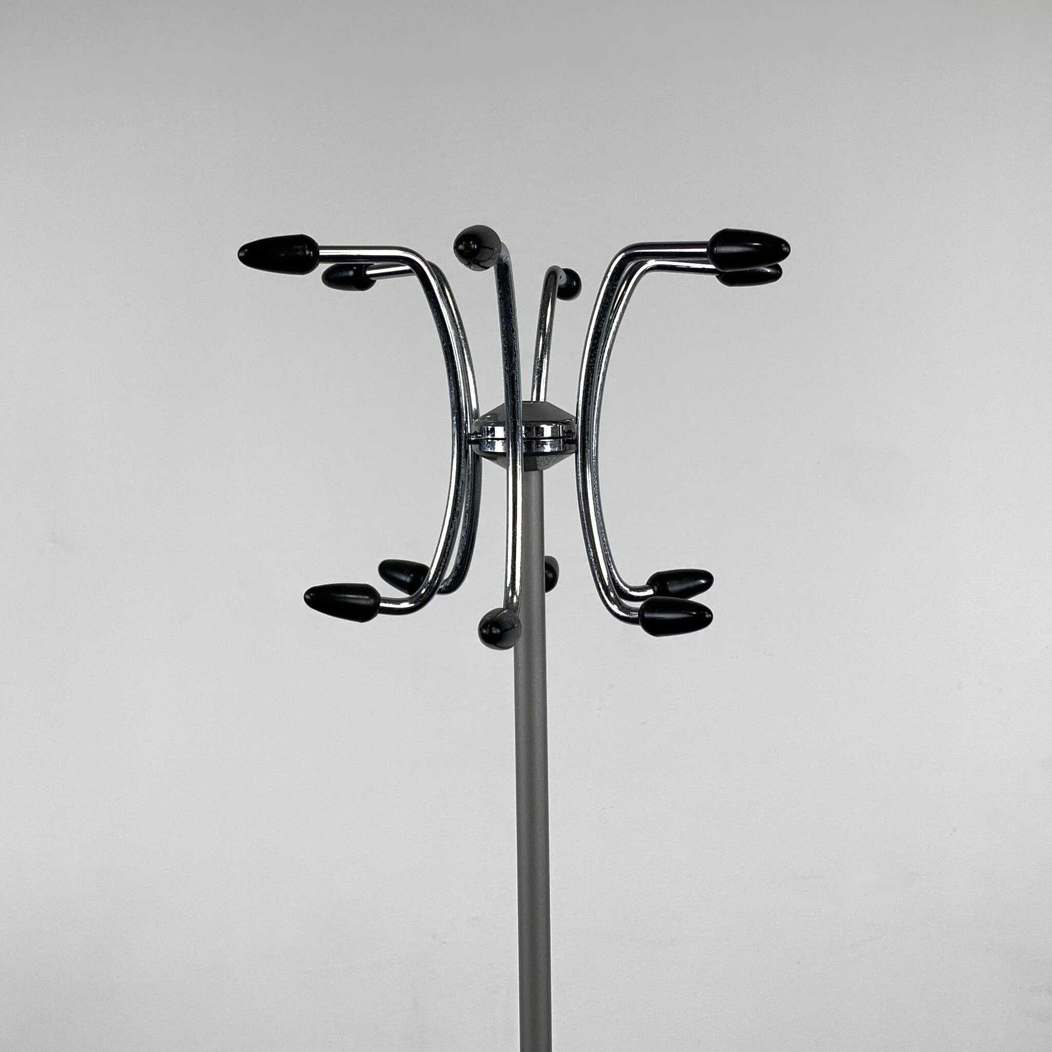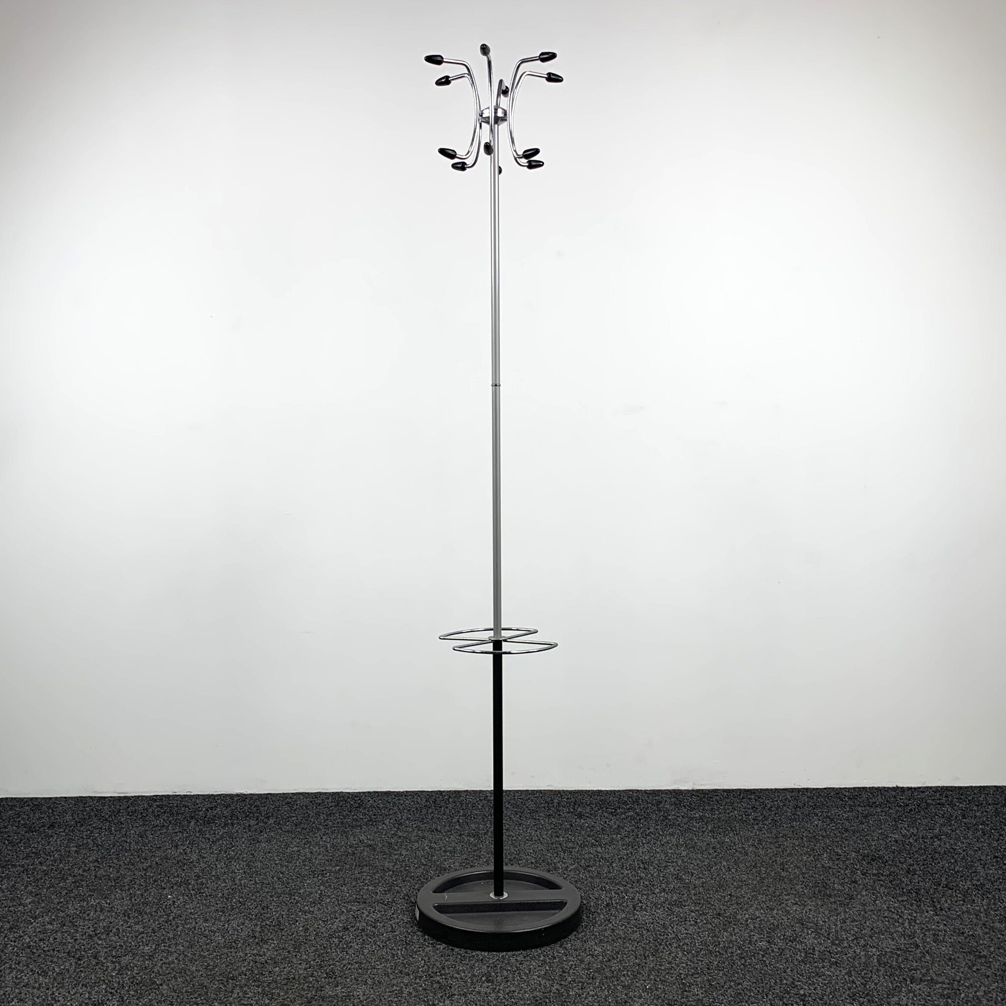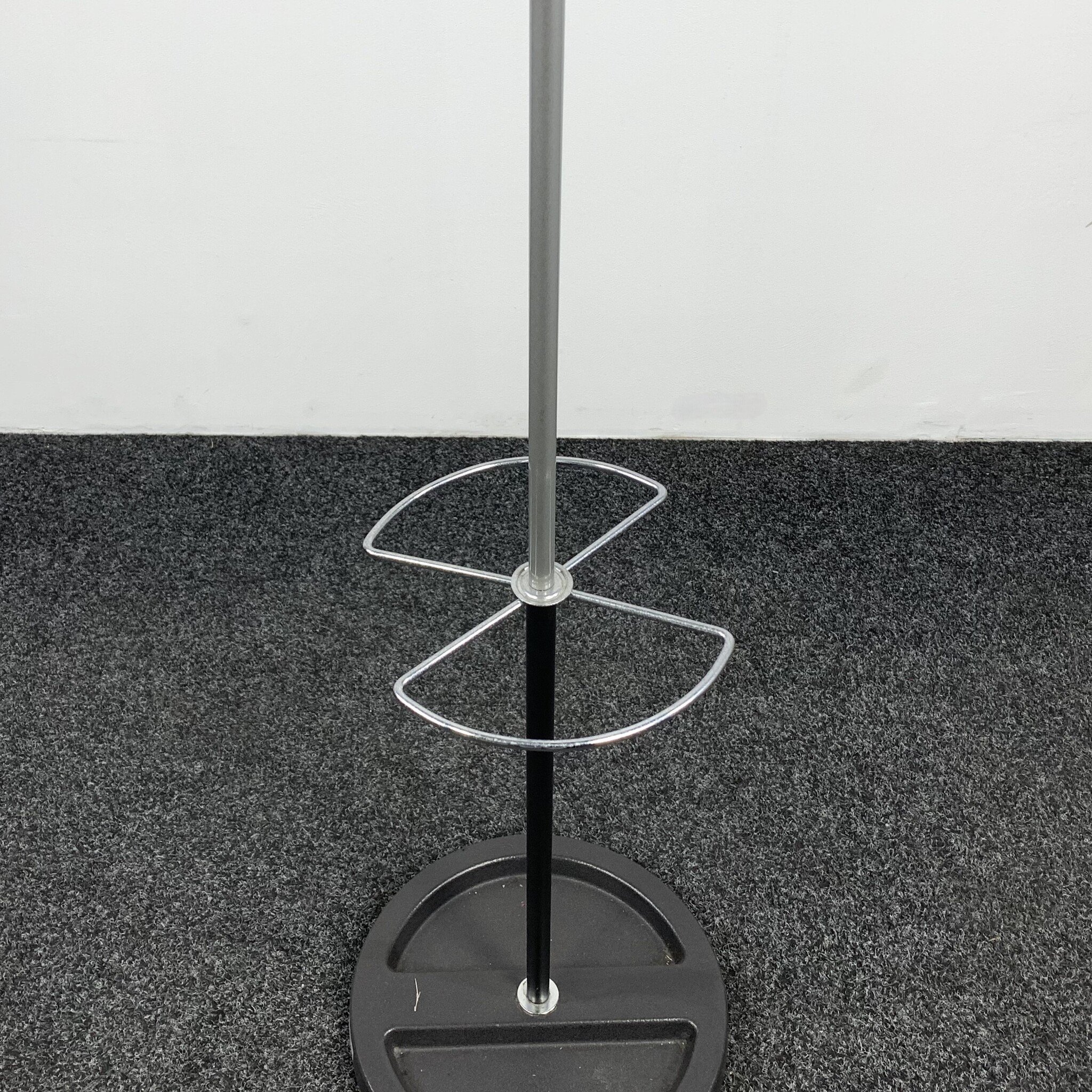 Staande kapstok van het merk Hago. Deze kapstok heeft een parapluhouder, beschikt over 12 haakjes. Het is een chrome kapstok met een zwarte ronde poot.