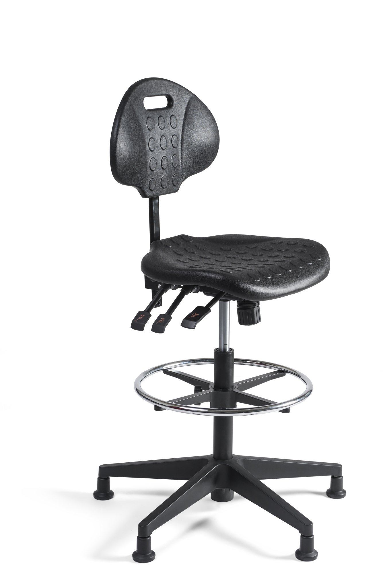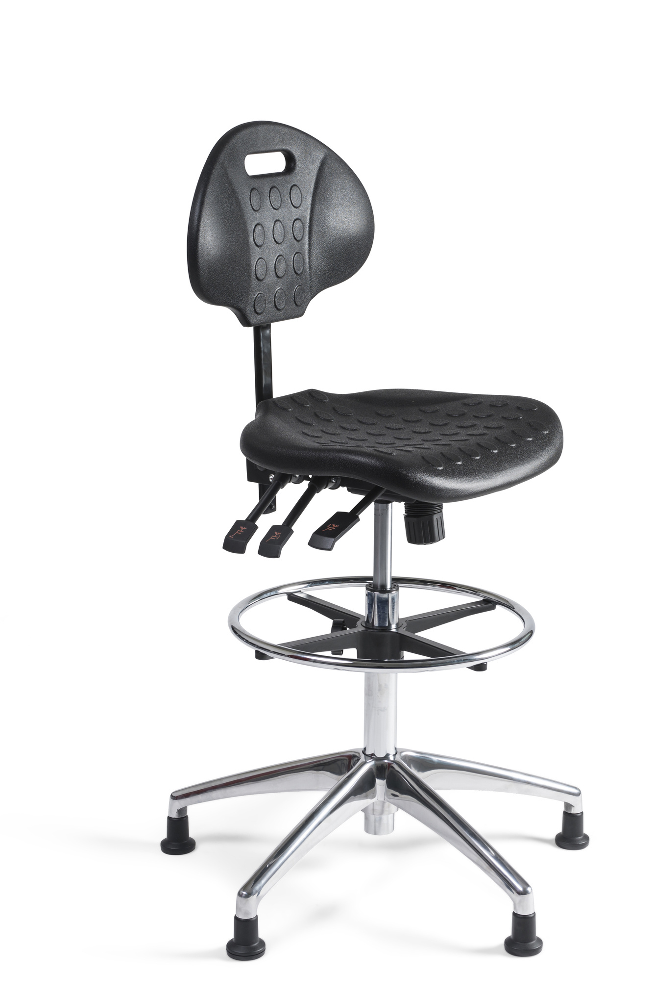 De Hoge Werkstoel met PU zitting is een functionele en ergonomische werkstoel voor werkzaamheden op hoogte. De onderhoudsvriendelijke PU zitting is geschikt voor intensief gebruik. De in hoogte verstelbare rugleuning, zithoogteverstelling en rug- en zithoekverstelling zorgen voor een comfortabele zithouding. Het voetkruis met voetenring en glijdoppen biedt stabiele ondersteuning en is leverbaar in zwart kunststof of gepolijst aluminium.