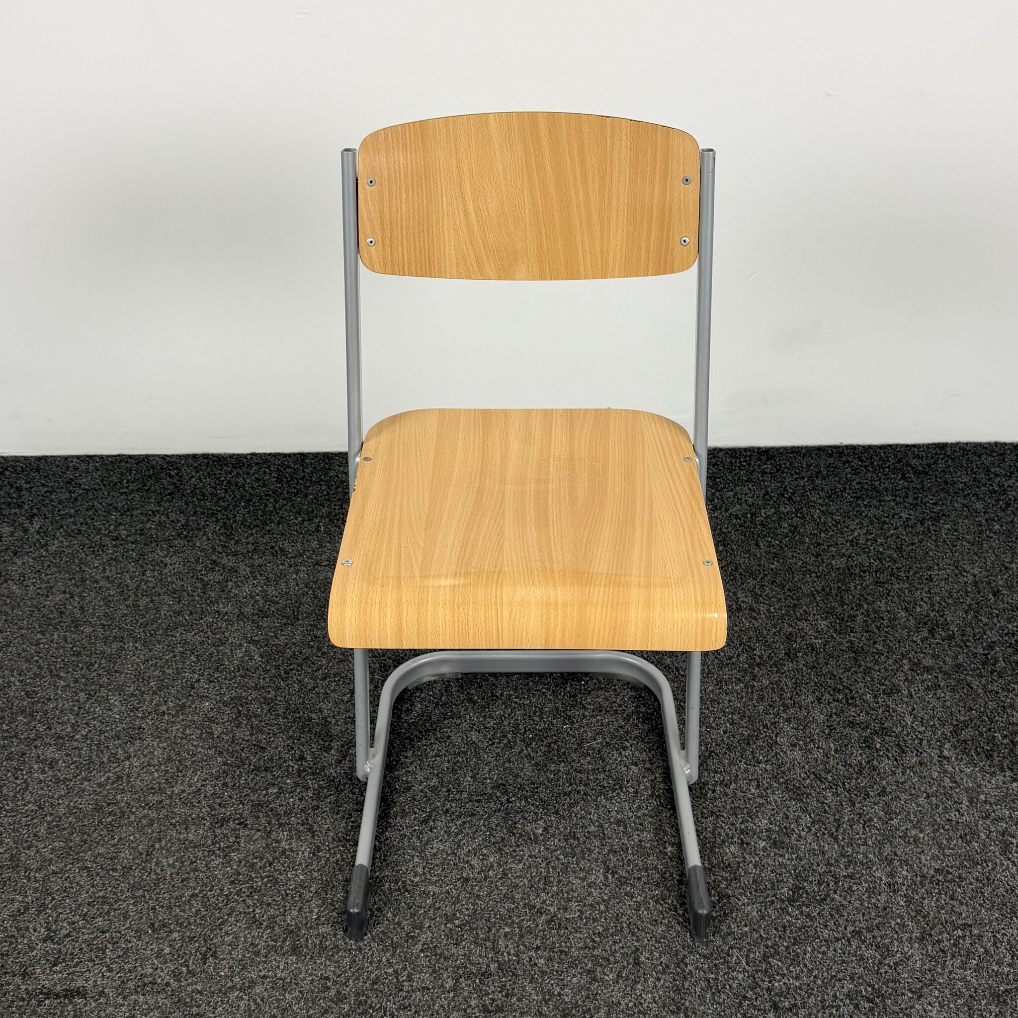 Gebruikte houten stoel met grijs frame. De stoel heeft een houten zitting, een houten rugleuning en is stapelbaar.
