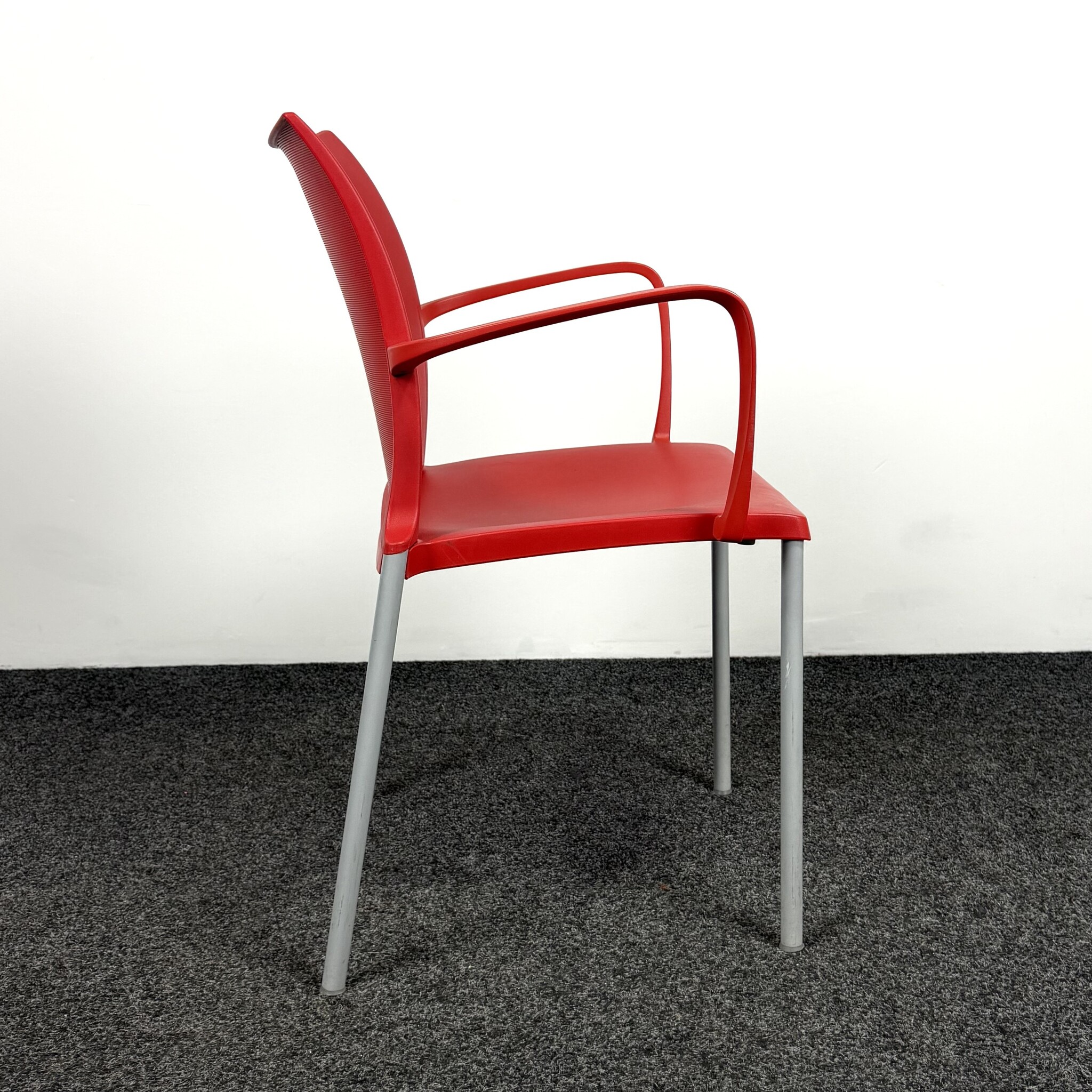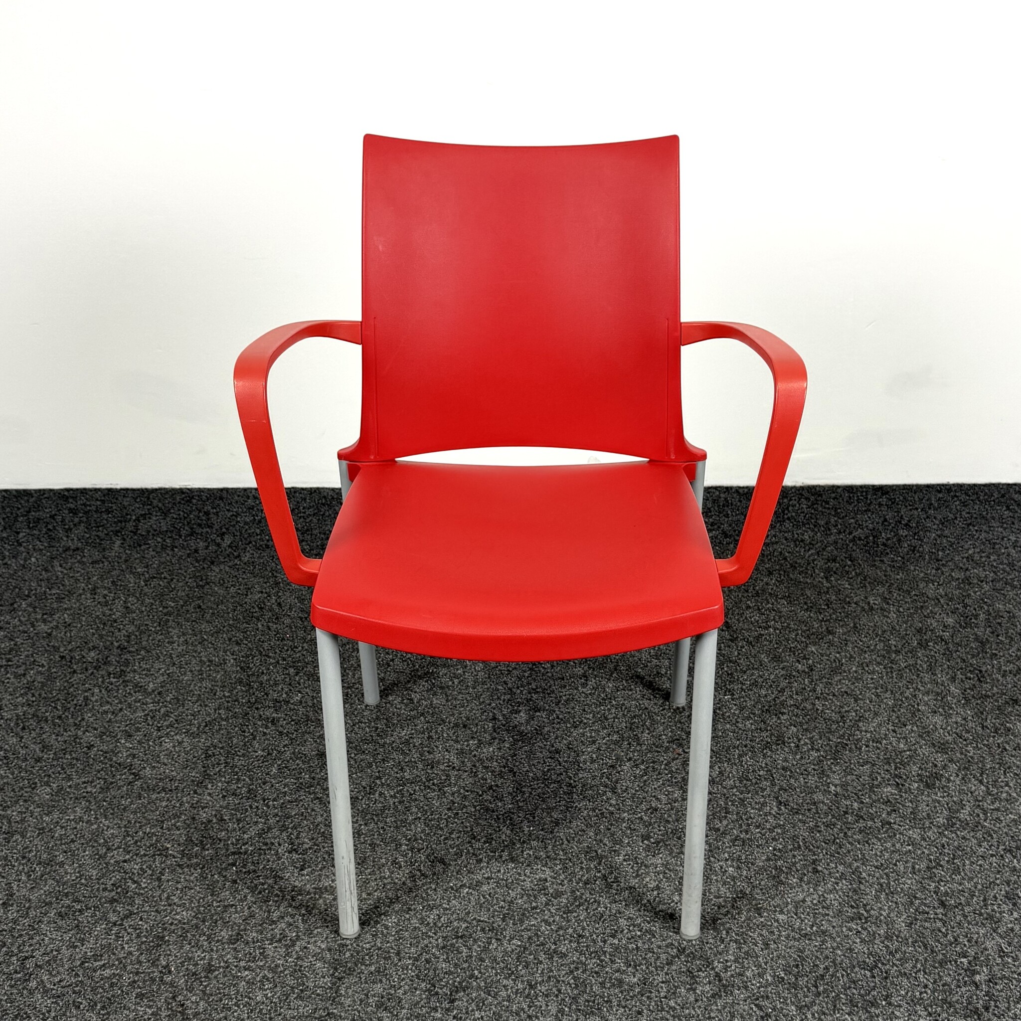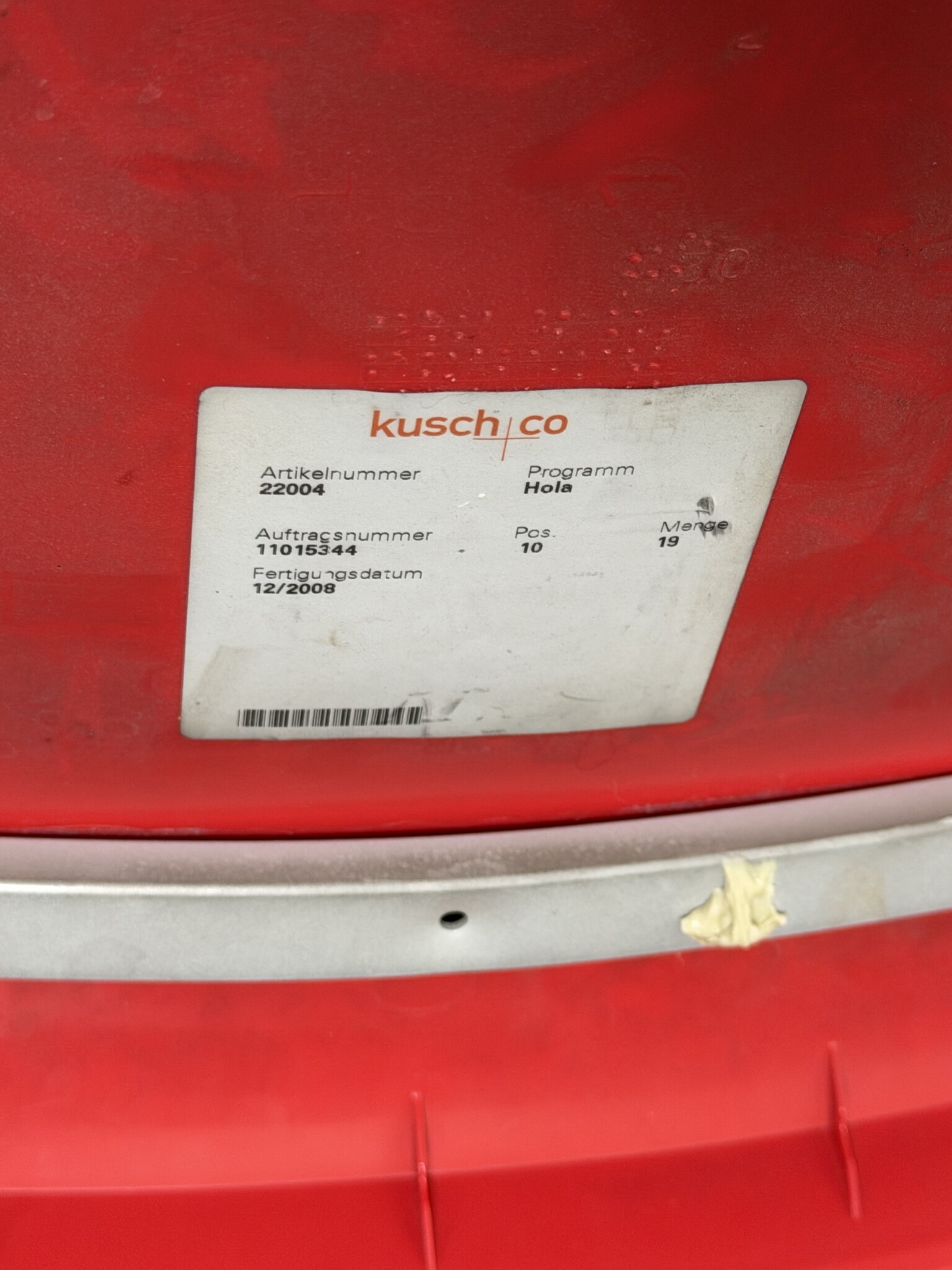 De Kusch & Go kantinestoel is een praktische en comfortabele stoel voor diverse ruimtes. De rode kunststof zitting geeft een frisse uitstraling en is eenvoudig te reinigen. Het vierpoots onderstel met vaste armleggers biedt stevige ondersteuning. Deze gebruikte stoel is stapelbaar en daardoor ruimtebesparend op te bergen.