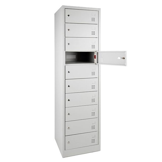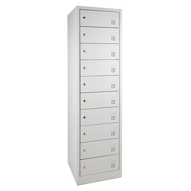 Deze 10-deurs laptopkast biedt een veilige en efficiënte oplossing voor het opbergen en opladen van laptops en/of Chromebooks. Elke locker is uitgerust met een 220V-aansluiting, waardoor devices direct opladen zodra ze worden opgeborgen. De kast is voorzien van cilindersloten met sleutels, rubberen stootblokjes en een centrale aan/uit-knop voor optimaal gebruiksgemak. Met zijn grijze afwerking en compacte afmetingen is deze nieuwe laptopkast ideaal voor scholen, kantoren of gedeelde werkruimtes.