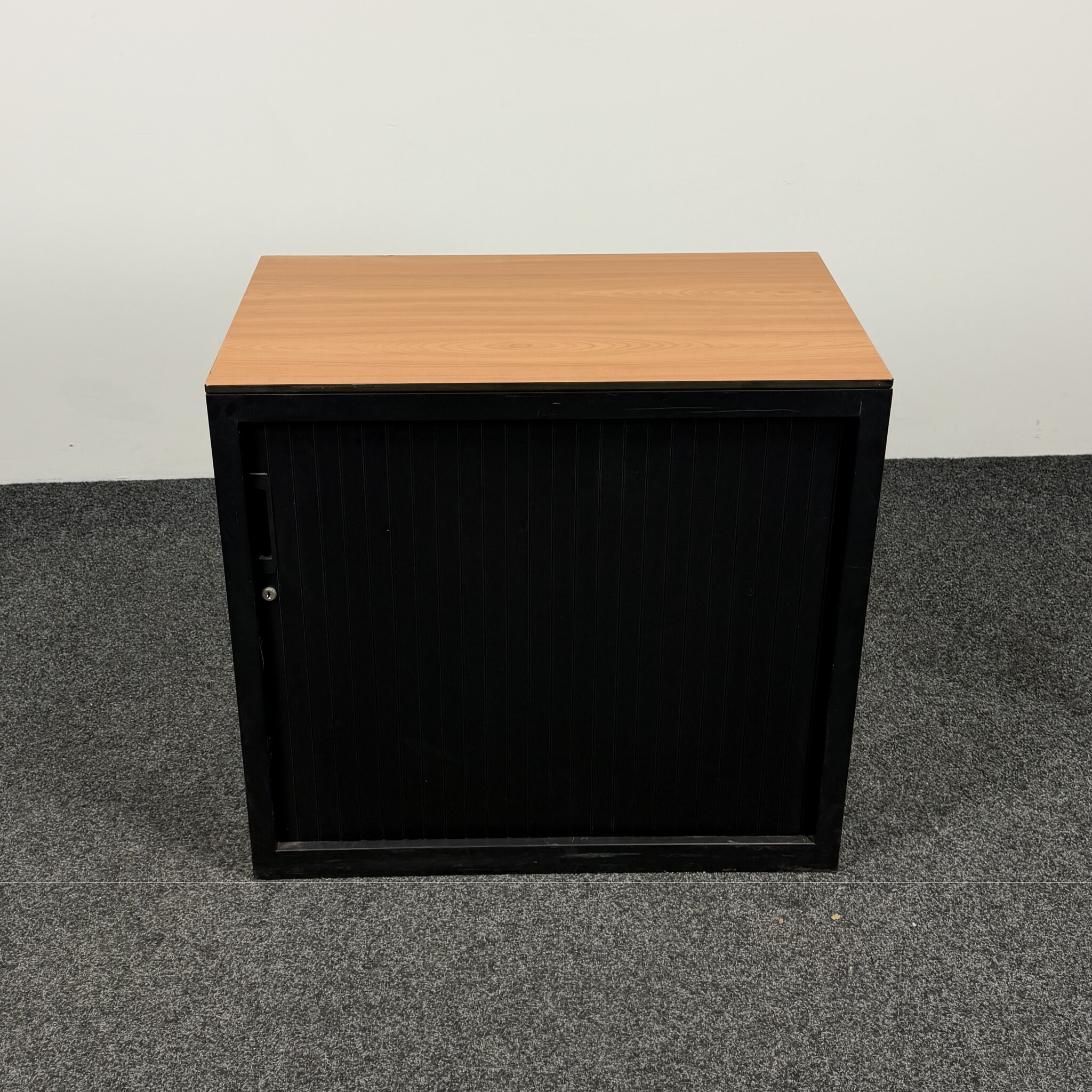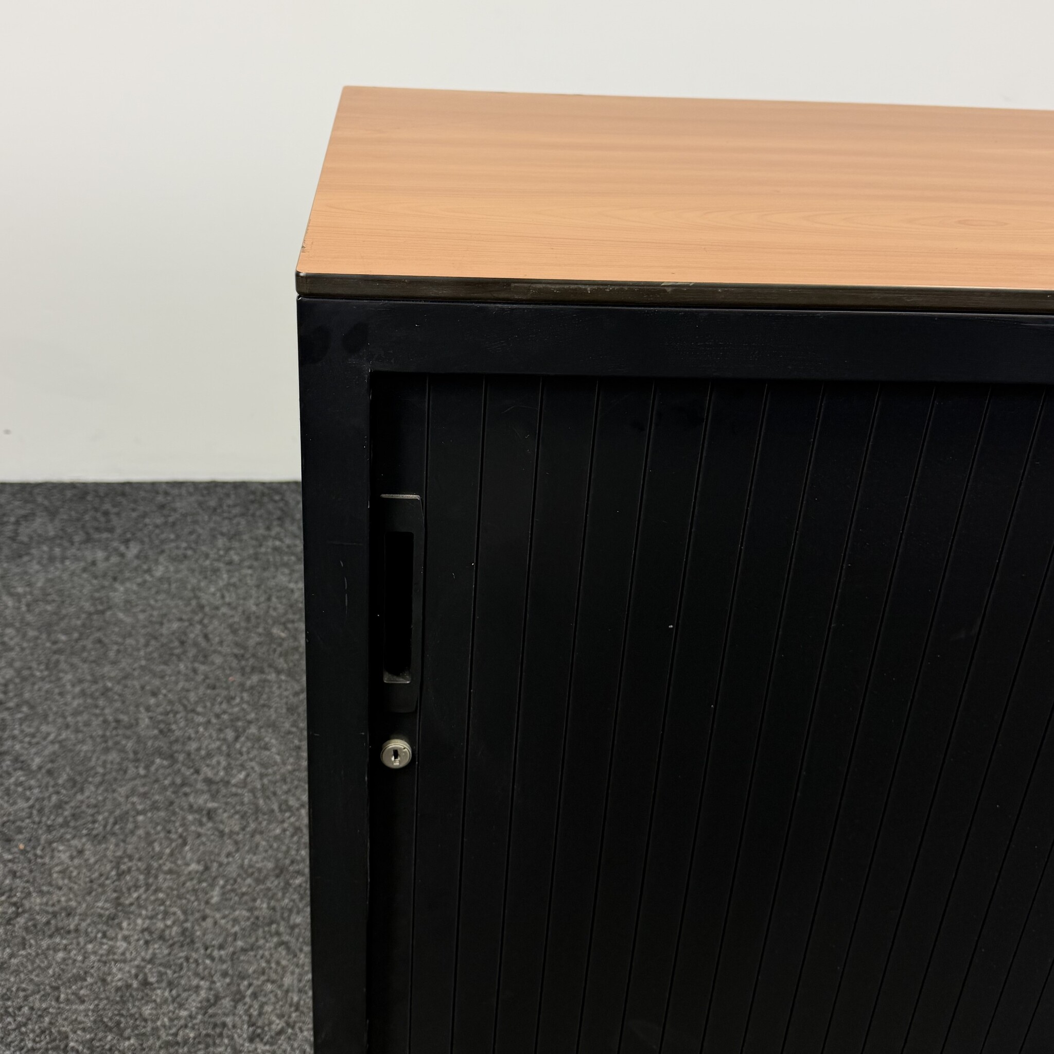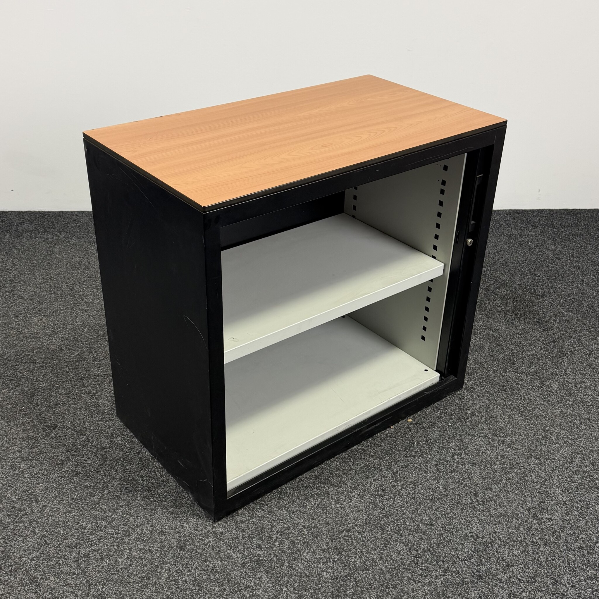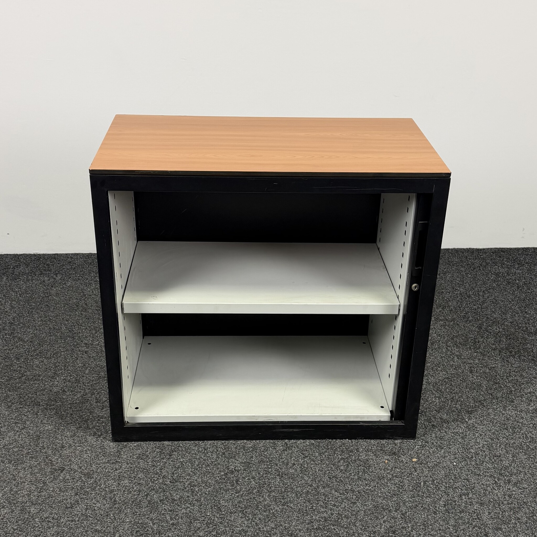 De Lensvelt archiefkast is een compacte en functionele opbergkast voor kantoor. De zwarte ombouw met bijpassende stalen roldeur en het houten topblad geven de kast een moderne uitstraling. Voorzien van één in hoogte verstelbaar legbord, ideaal voor het netjes opbergen van dossiers en kantoorartikelen.