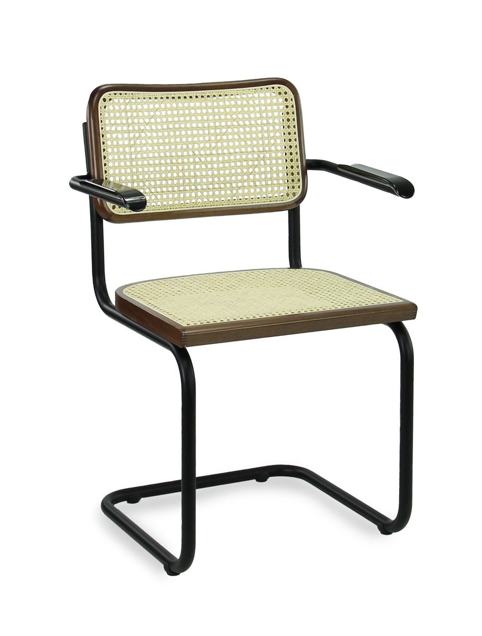 Nieuwe multifunctionele stoel. De LK 02 Francesca stoel + armleggers heeft een mat zwart sledeframe een walnoot rand van de zitting en rugleuning. Armleggers gemaakt van gematteerd bakeliet. De zitting en rug zijn met echte webbing bespannen waardoor de stoel een klassieke uitstraling heeft die supermodern is in deze tijd. De stoel is geschikt voor huiselijke en zakelijke interieurs.