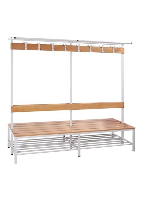 De LK Garderobe duo set is geschikt voor elke garderobe- of omkleedruimte. Het frame is van staal en de latten zijn van hoogwaardig kwaliteit hout. De houten zitting, houten rugleuning en houten rail voor de kledinghaken geven deze bank een warme, decoratieve uitstraling. Het stalen frame zorgt ervoor dat de LK Garderobe set zeer stabiel is waardoor hij nog lang mee zal gaan.