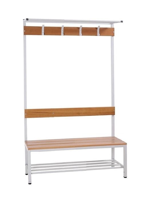 De LK Garderobe set is geschikt voor elke garderobe- of omkleedruimte. Het frame is van staal en de latten zijn van hoogwaardig kwaliteit hout. De houten zitting, houten rugleuning en houten rail voor de kledinghaken geven deze bank een warme, decoratieve uitstraling. Het stalen frame zorgt ervoor dat de LK Garderobe set zeer stabiel is waardoor hij nog lang mee zal gaan.