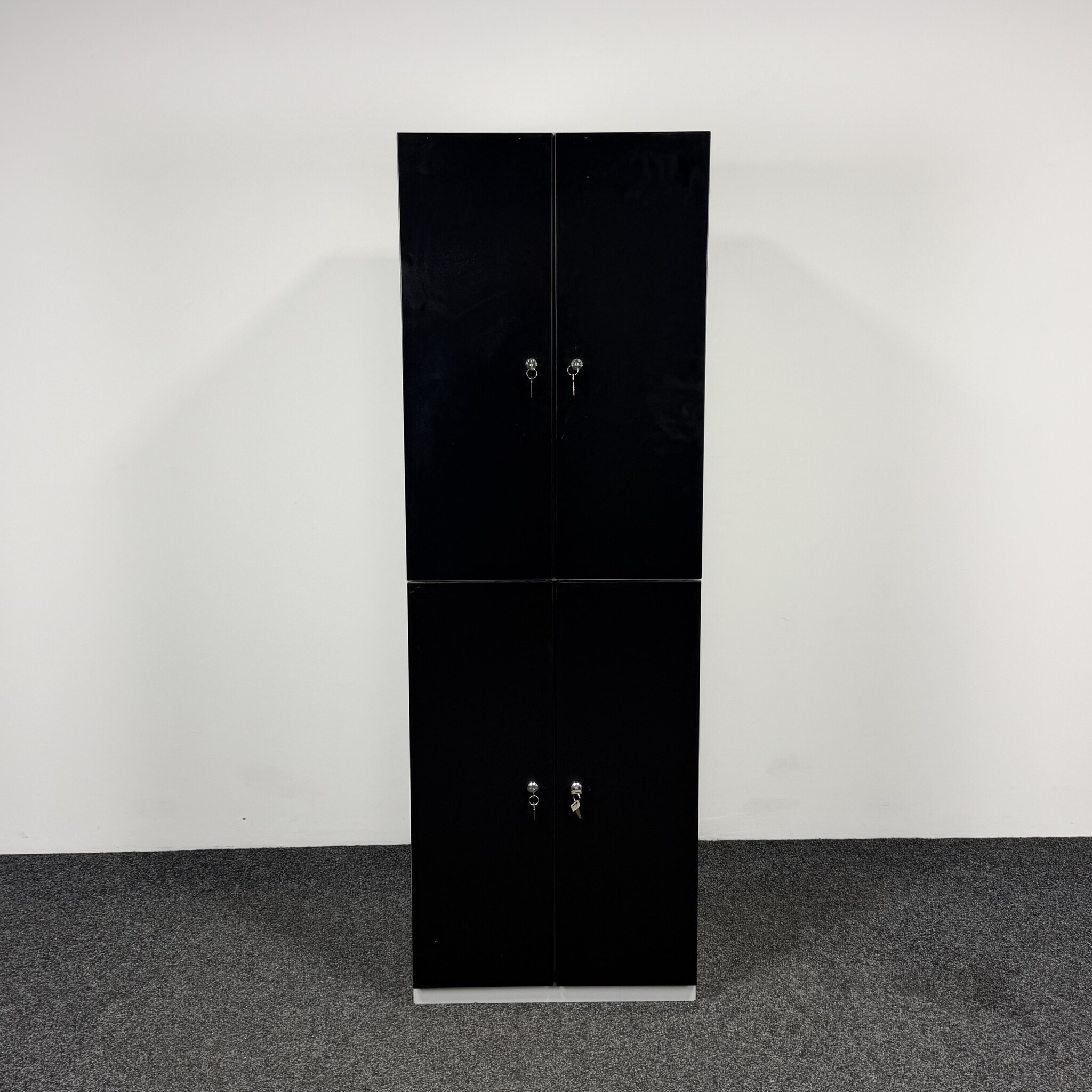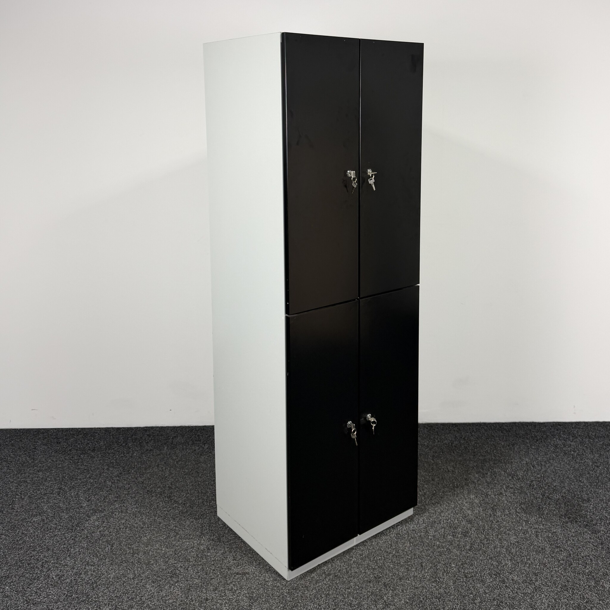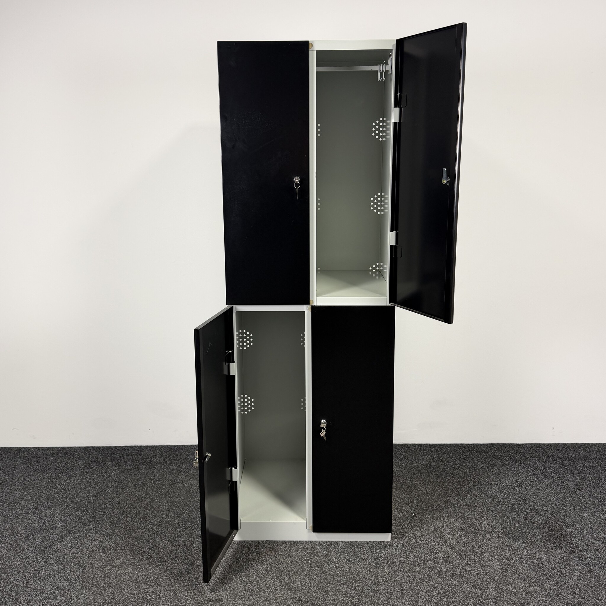 De lockerkast 4-deurs is een praktische en robuuste opbergoplossing voor kantoor, school of kleedruimte. Deze metalen kast heeft vier afsluitbare vakken met zwarte deuren en een grijze ombouw. Elk vak is voorzien van een ophangstang en haakjes, ideaal voor het veilig opbergen van persoonlijke spullen.