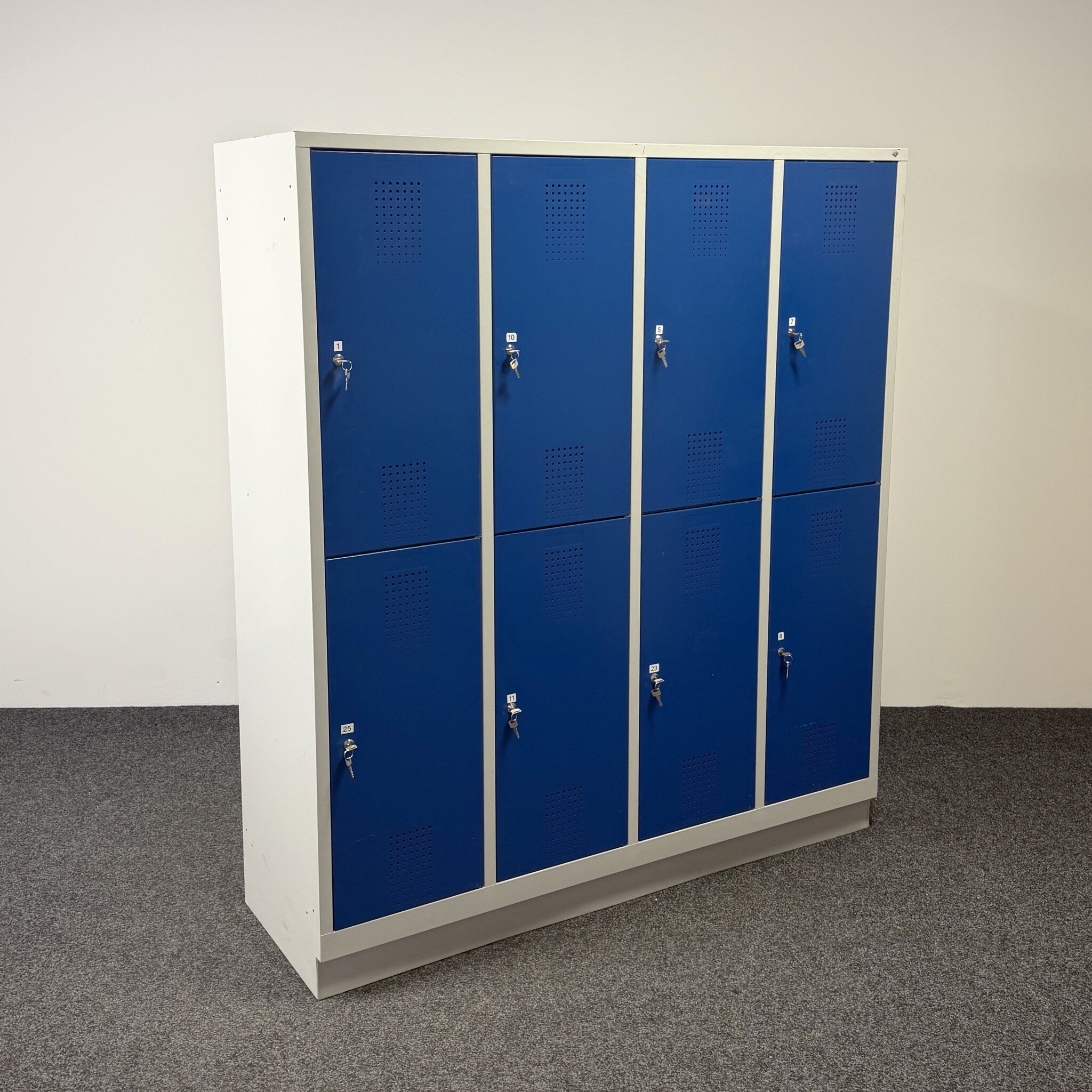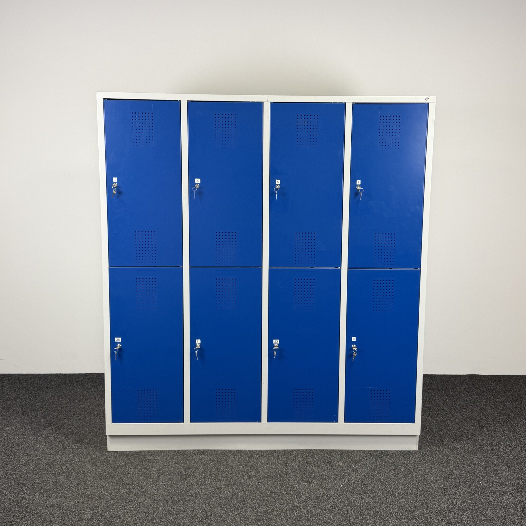 Deze lockerkast met 8 afsluitbare kluisjes is een praktische oplossing voor het opbergen van persoonlijke spullen. De kast heeft een grijze ombouw met blauwe deuren en een frisse uitstraling. De lockers zijn voorzien van ophanghaken en ventilatiegaten. Dankzij de ruime afmetingen is de kast geschikt voor kleedruimtes, kantoren of magazijnen.