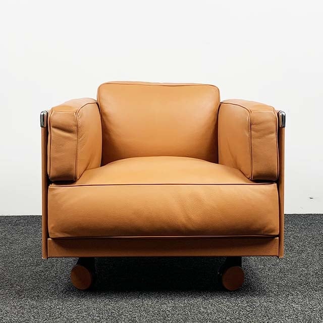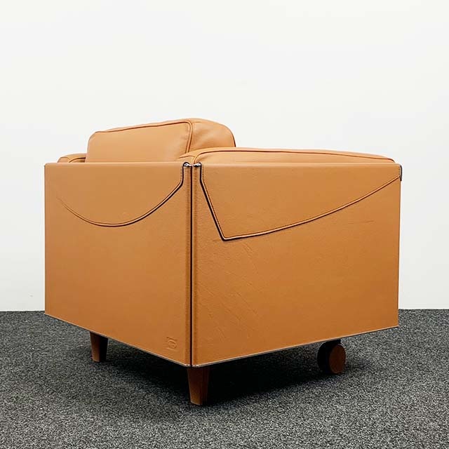 Royale, zeer comfortabele clubzetels van Poltrona Frau. in 1996 ontworpen door Pierluigi Cerri. De buitenkant is van bruin tuigleer en is afgewerkt met een mooi stiksel en Chrome details. De binnenkant is van zacht bruin SC leer. Door zijn prachtige afwerking kan hij ook erg goed vrij in de ruimte worden geplaatst. Aan de voorzijde van de stoel zitten 2 wielen waardoor hij gemakkelijk te verplaatsen is.