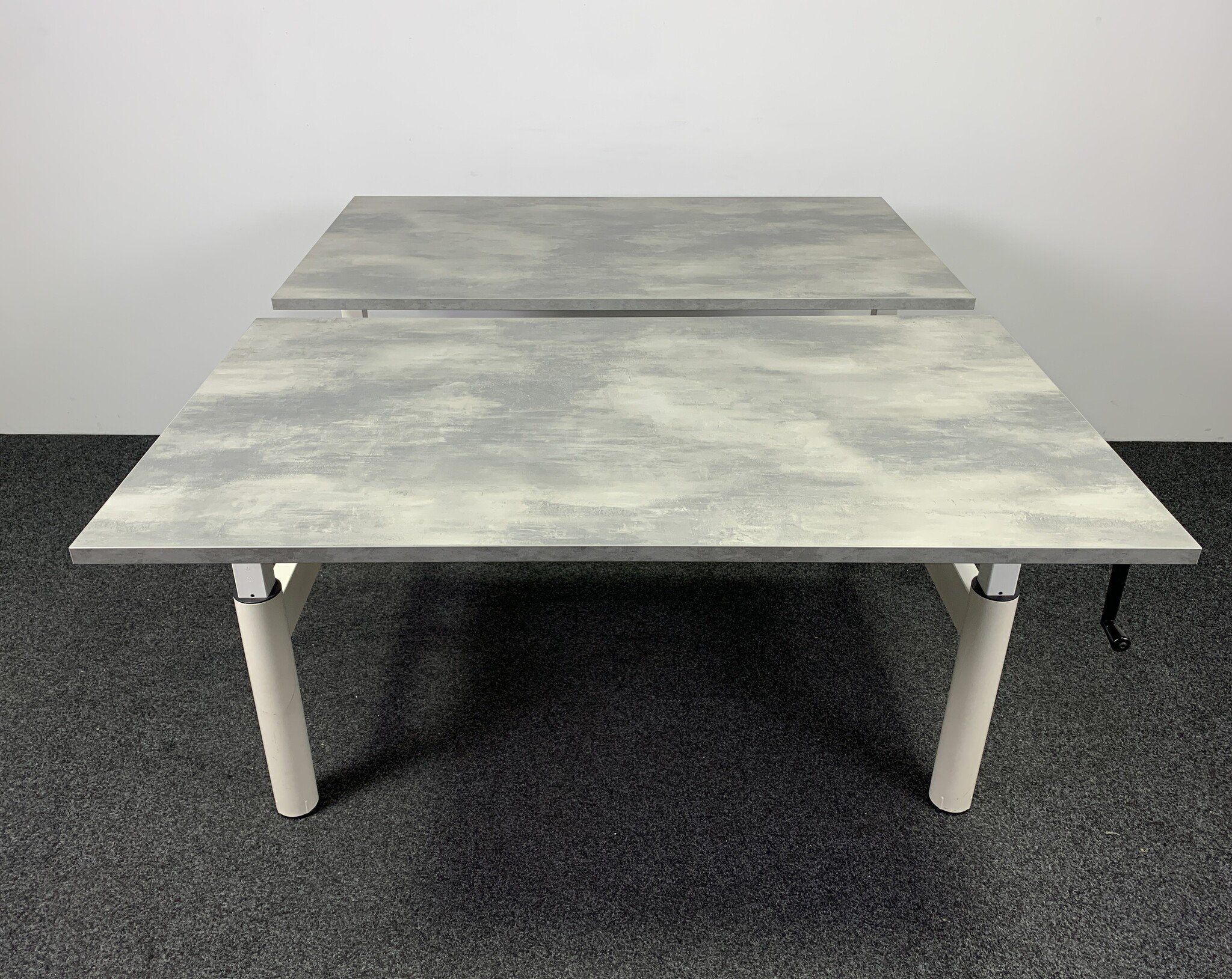 Refurbished Gispen duo-werkplek. Dit dubbele bureau beschikt over 2 nieuw bureaubladen naar keuze van 140×80 cm, en een wit gebruikt onderstel. De werkplekken zijn individueel in hoogte verstelbaar door middel van een slinger. Verstelbaar van 62 centimeter tot en met 86 centimeter.