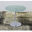 Gebruikte bijzettafel met glazen blad en voet. In uiteenlopende ruimtes in te zetten, zoals wachtkamers, kantines of in uw woning.