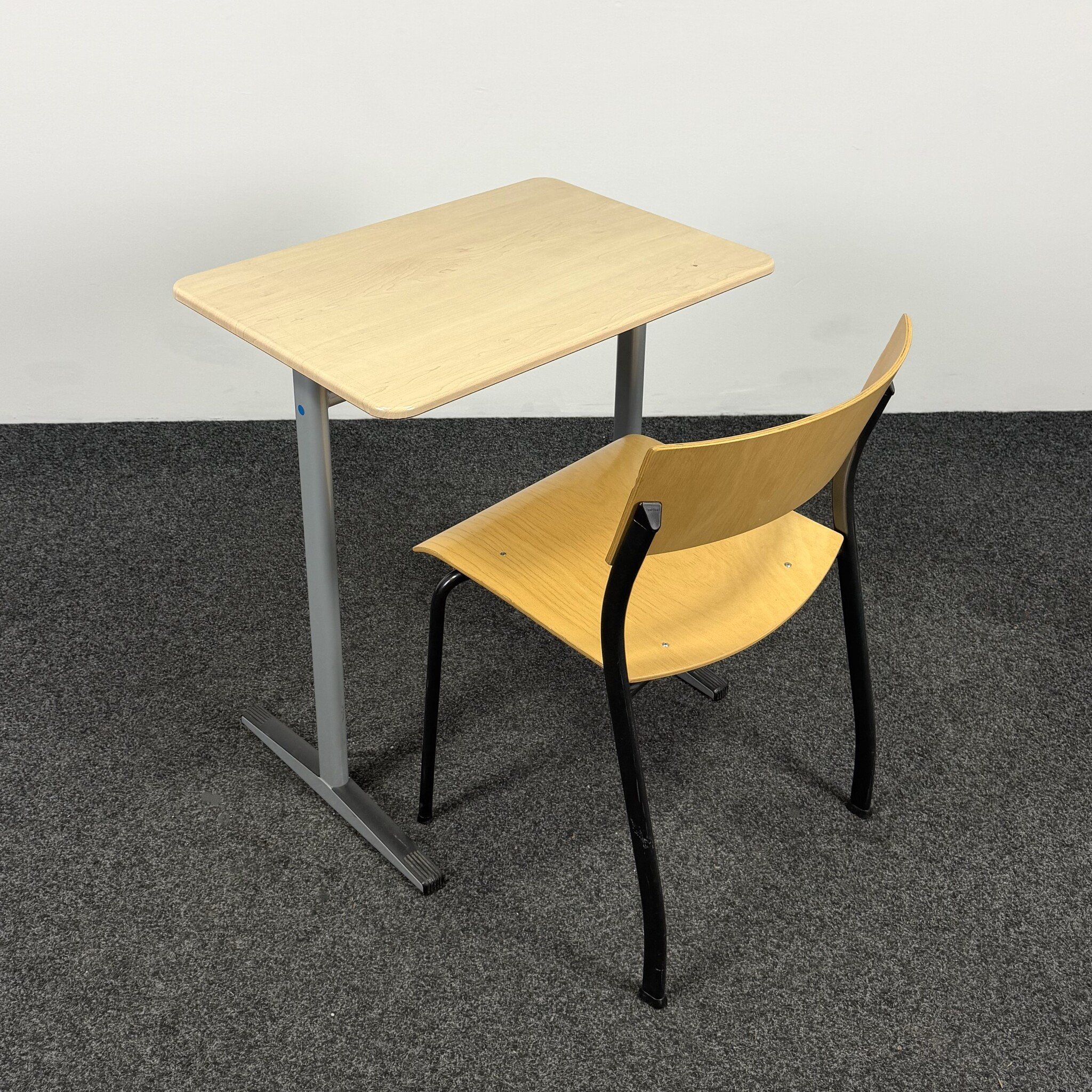 Dit schoolsetje bestaat uit een Ahrend schoolstoel en een schoolbureau. De stoel heeft een stevig zwart metalen onderstel met een beukenhouten zitting en is bovendien stapelbaar. Het bureau heeft een grijs onderstel met een ahorn blad en biedt een fijne werkruimte. Een functioneel setje dat ideaal is voor scholen, studieplekken of thuiswerkplekken
