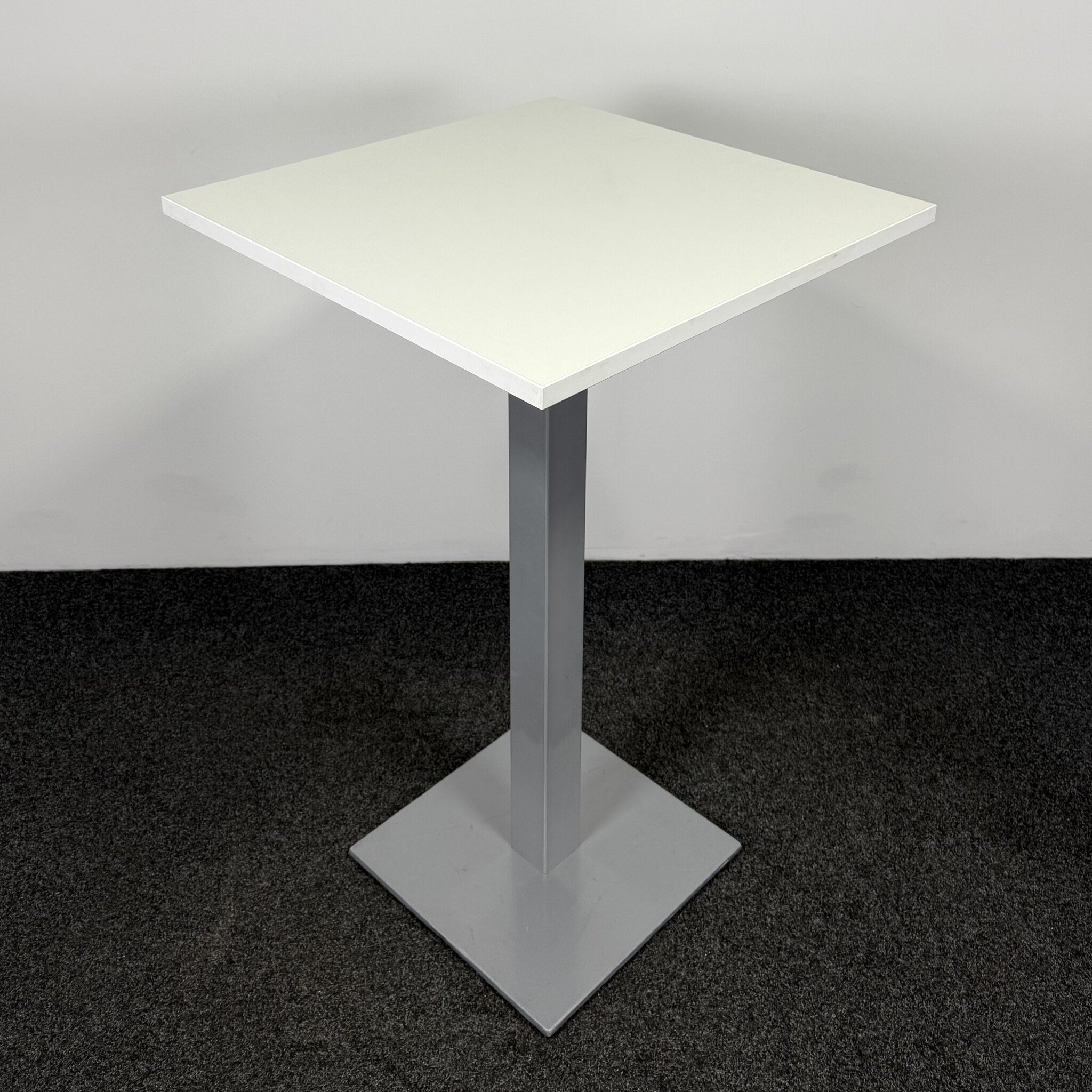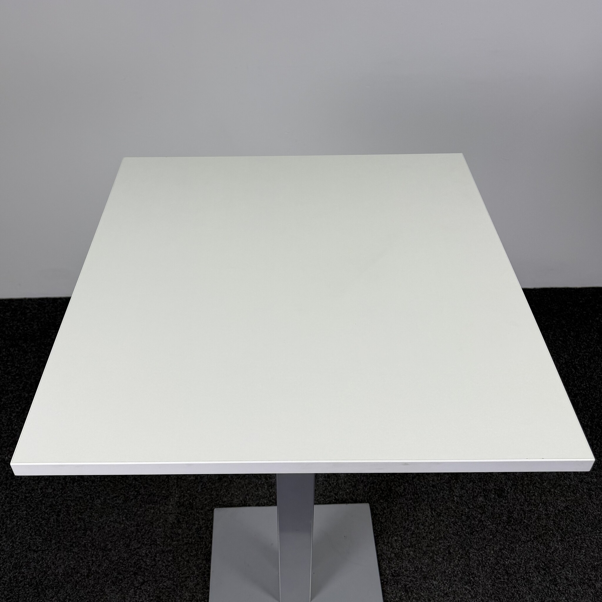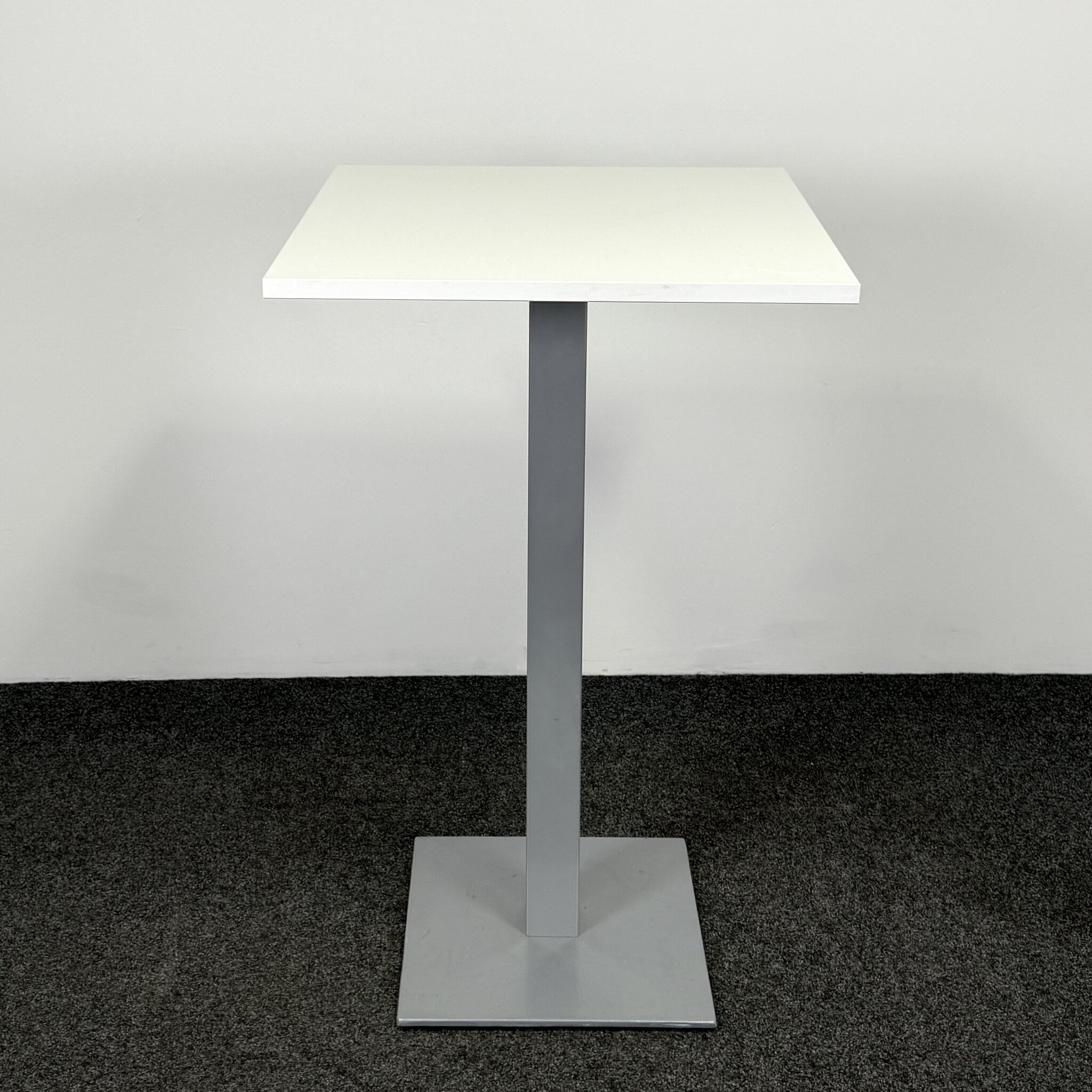 Deze statafel met wit houten blad is een stijlvolle en praktische oplossing voor kantoor, kantine of ontvangstruimtes. Het grijze onderstel zorgt voor een stabiele basis en de tafel heeft een vaste hoogte van 113 cm. Optioneel kan het blad vervangen worden door een nieuw 80x80 cm of rond Ø80 cm blad.