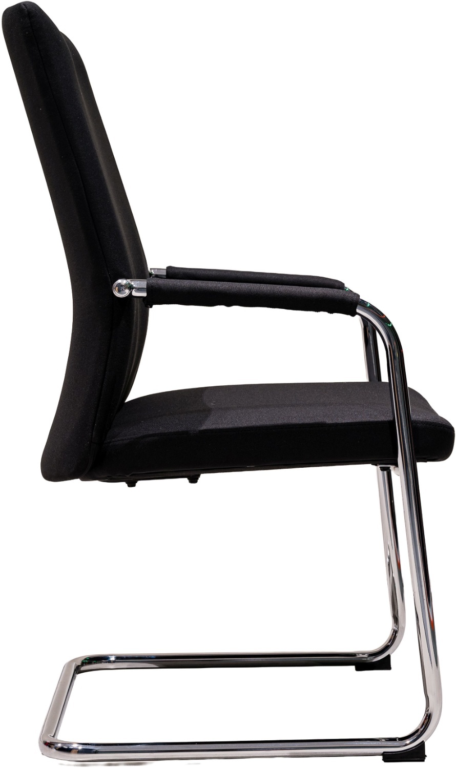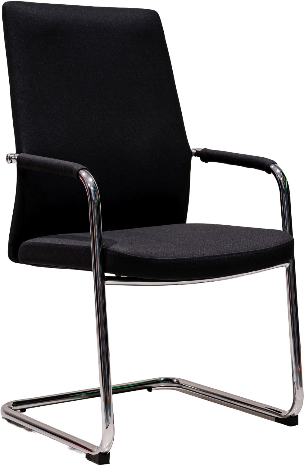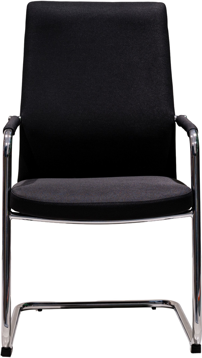 Nieuwe vergaderstoel Helsinki. Deze multifunctionele stoel heeft een chroom slede onderstel, een zwart gestoffeerde rug en zitting en armleggers.