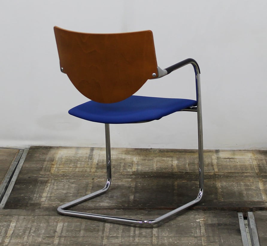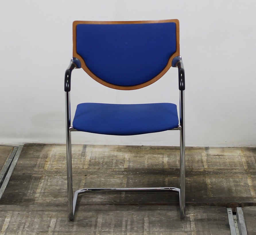 Gebruikte vergaderstoel met blauwe stoffering, houten rugleuning en chroom slede onderstel. Deze vergaderstoel met armleuning is bruikbaar in diverse ruimtes. Deze betaalbare vergaderstoel beschikt over een flexibel slede onderstel, welke ervoor zorgt dat de stoel lichtjes mee veert tijdens het zitten.