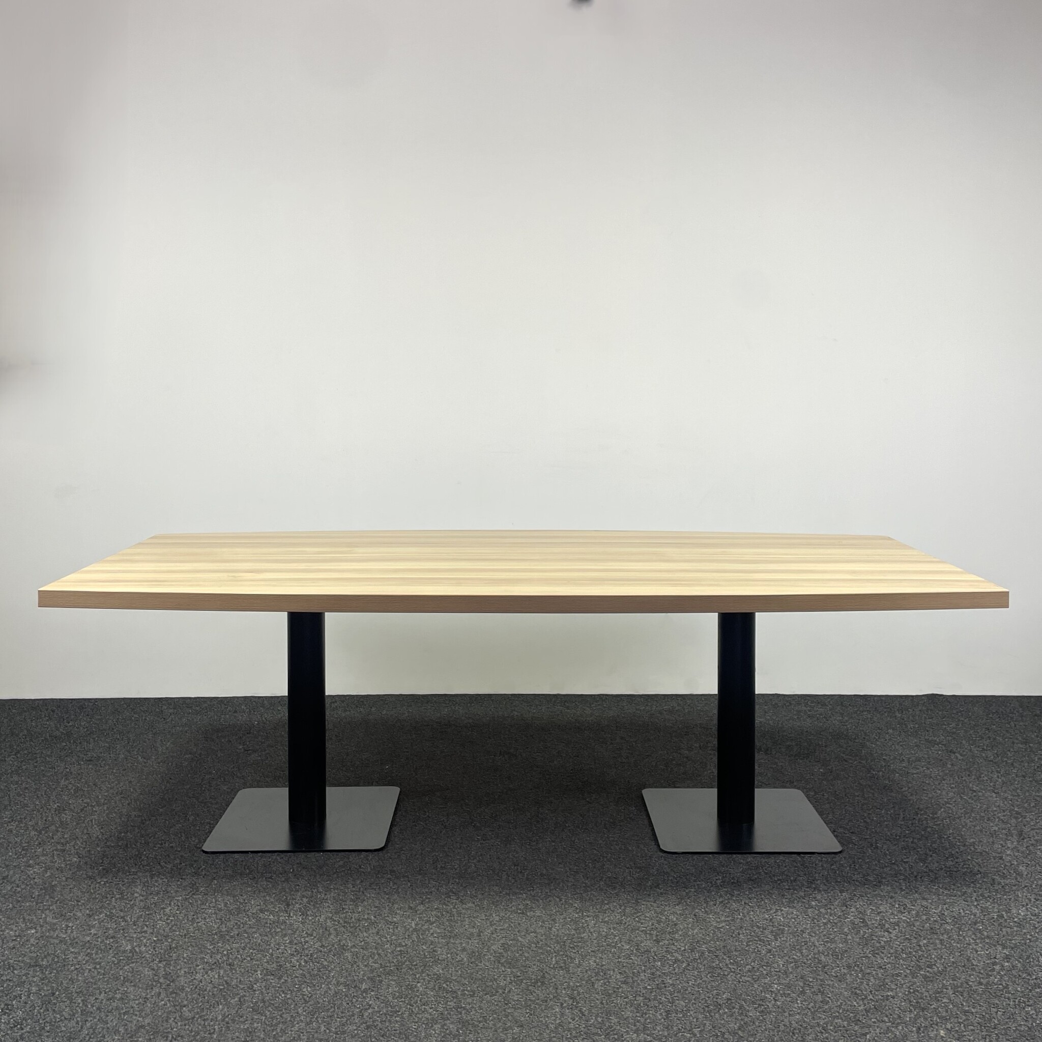 Strakke en moderne vergadertafel met een eiken blad en stevige, zwarte stalen poten. De tafel heeft een stijlvolle uitstraling en is perfect voor iedere vergaderruimte of kantooromgeving.