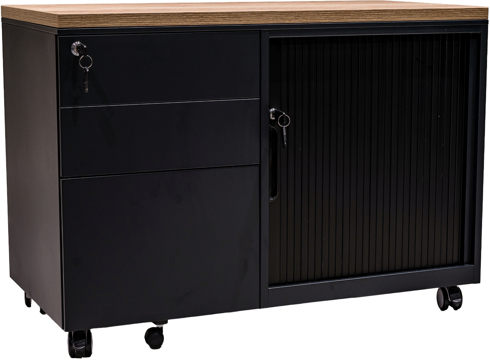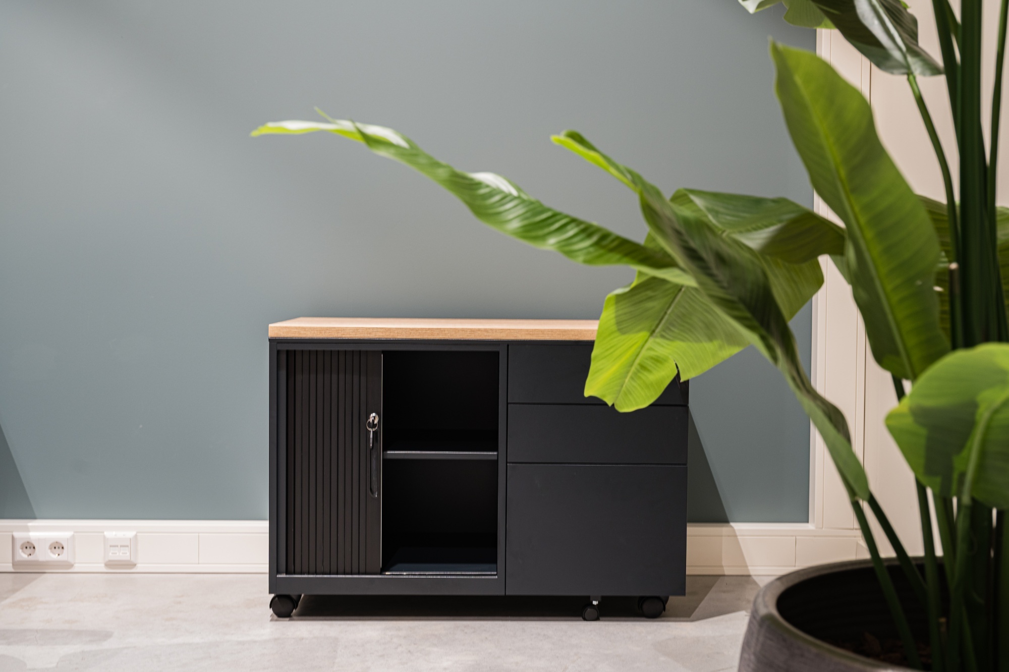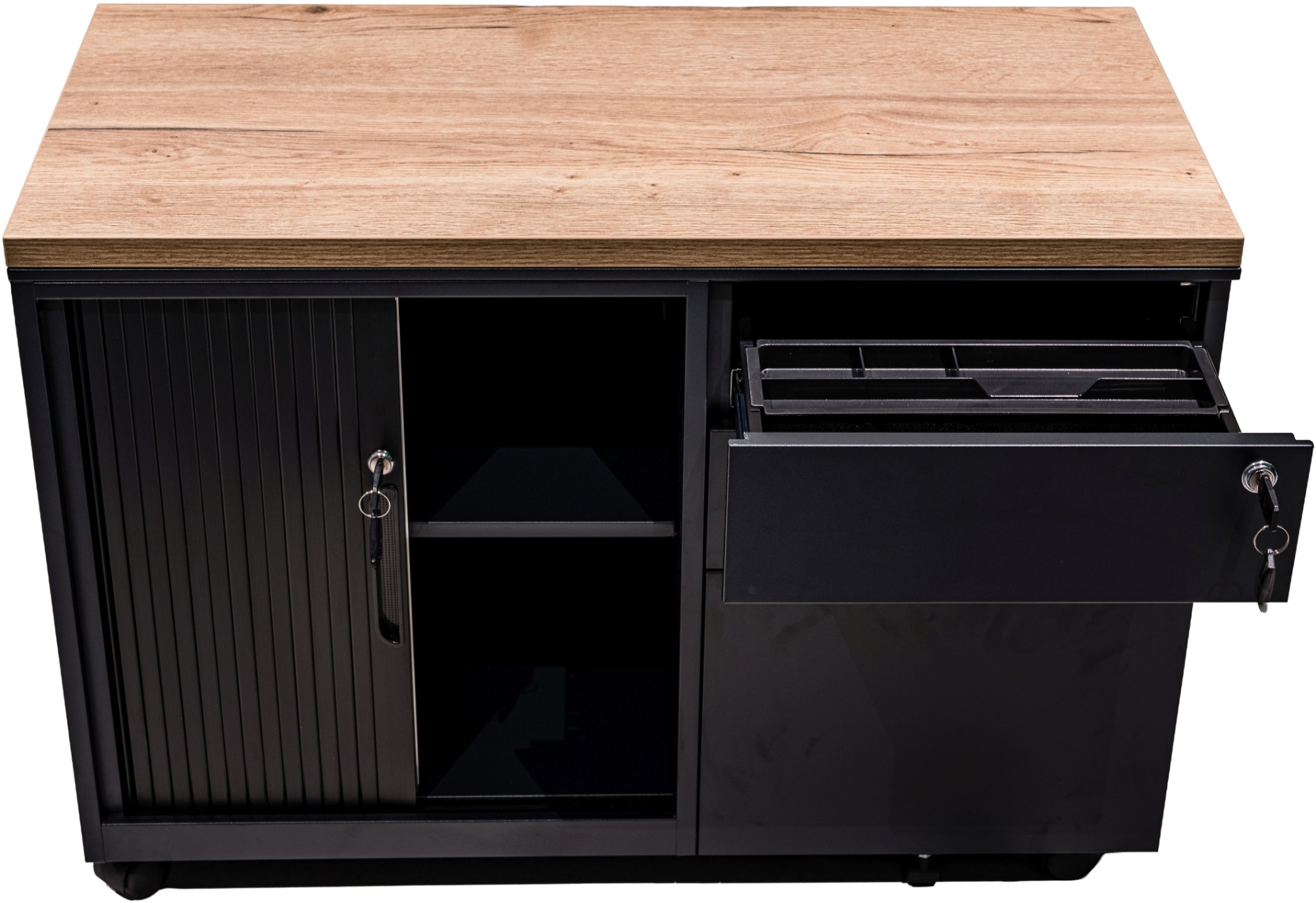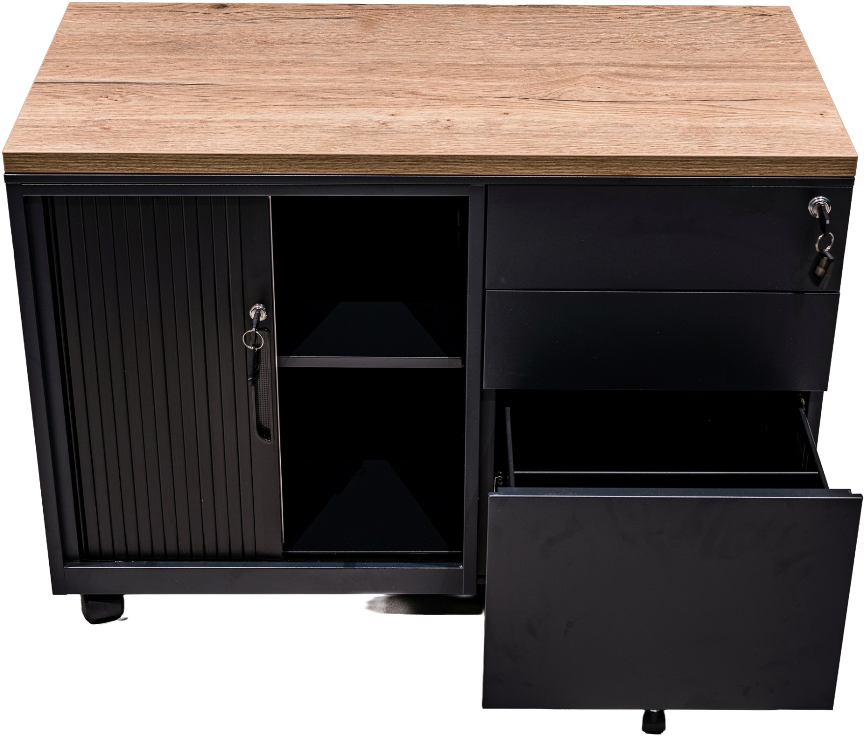 Dit verrijdbare ladeblok met schuifdeur is een praktische en flexibele opbergoplossing voor kantoor of thuiswerkplek. Het stalen ladeblok is uitgevoerd in zwart en beschikt over drie lades met pennenbakje en één legbord. Dankzij de wielen is het ladeblok eenvoudig te verplaatsen. Optioneel uit te breiden met een topblad in natuur eiken of midden eiken.