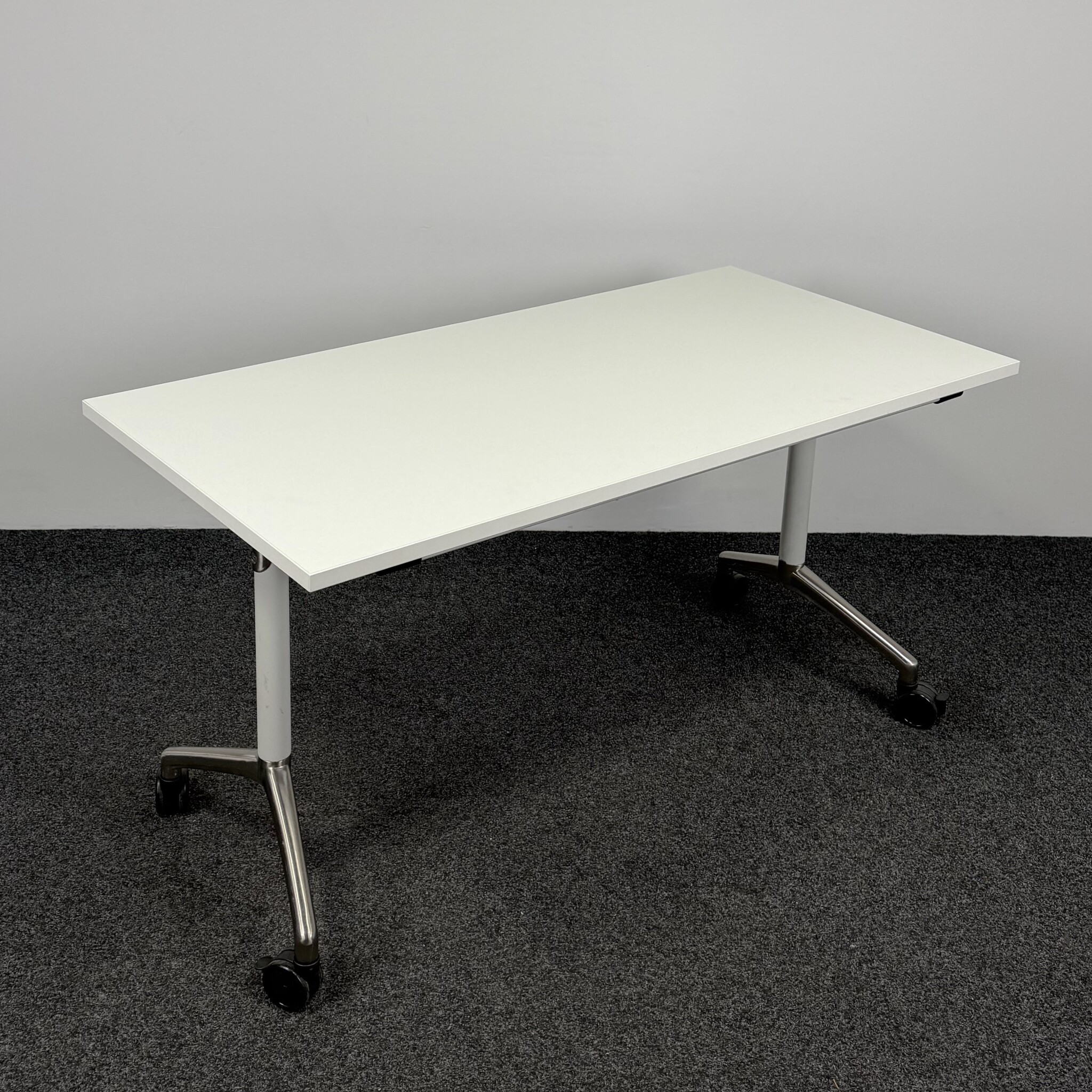 Deze verrijdbare klaptafel met origineel wit blad is een praktische en ruimtebesparende oplossing voor kantoren, vergaderruimtes en trainingsruimtes. Het chromen onderstel met geremde wielen maakt dat de tafel eenvoudig in te klappen en te verplaatsen is.