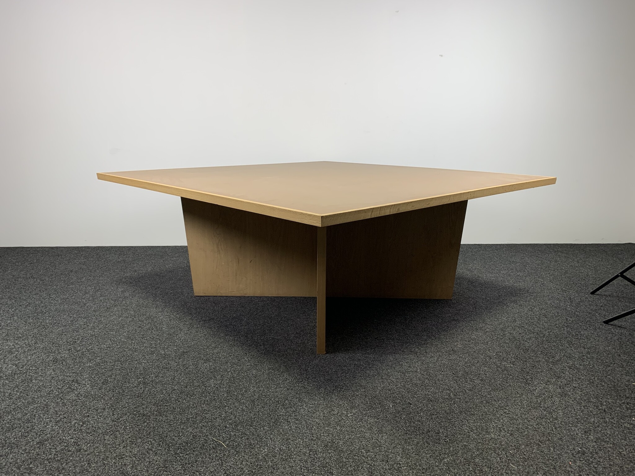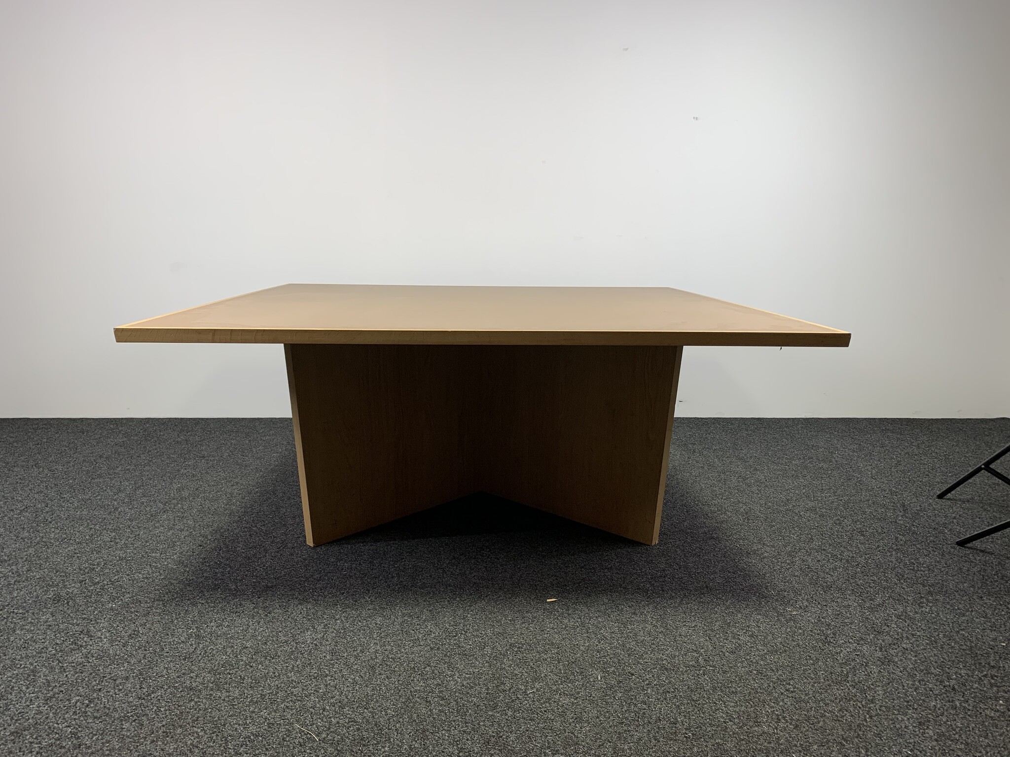 Gebruikte Vintage houten tafel. Deze tafel heeft een houten stervoet onderstel en een houten blad. De tafel is voor meerdere doeleinden te gebruiken mede door zijn vierkante blad. Het blad bevat enkele gebruikssporen echter kan de tafel nog prima een ronde mee.