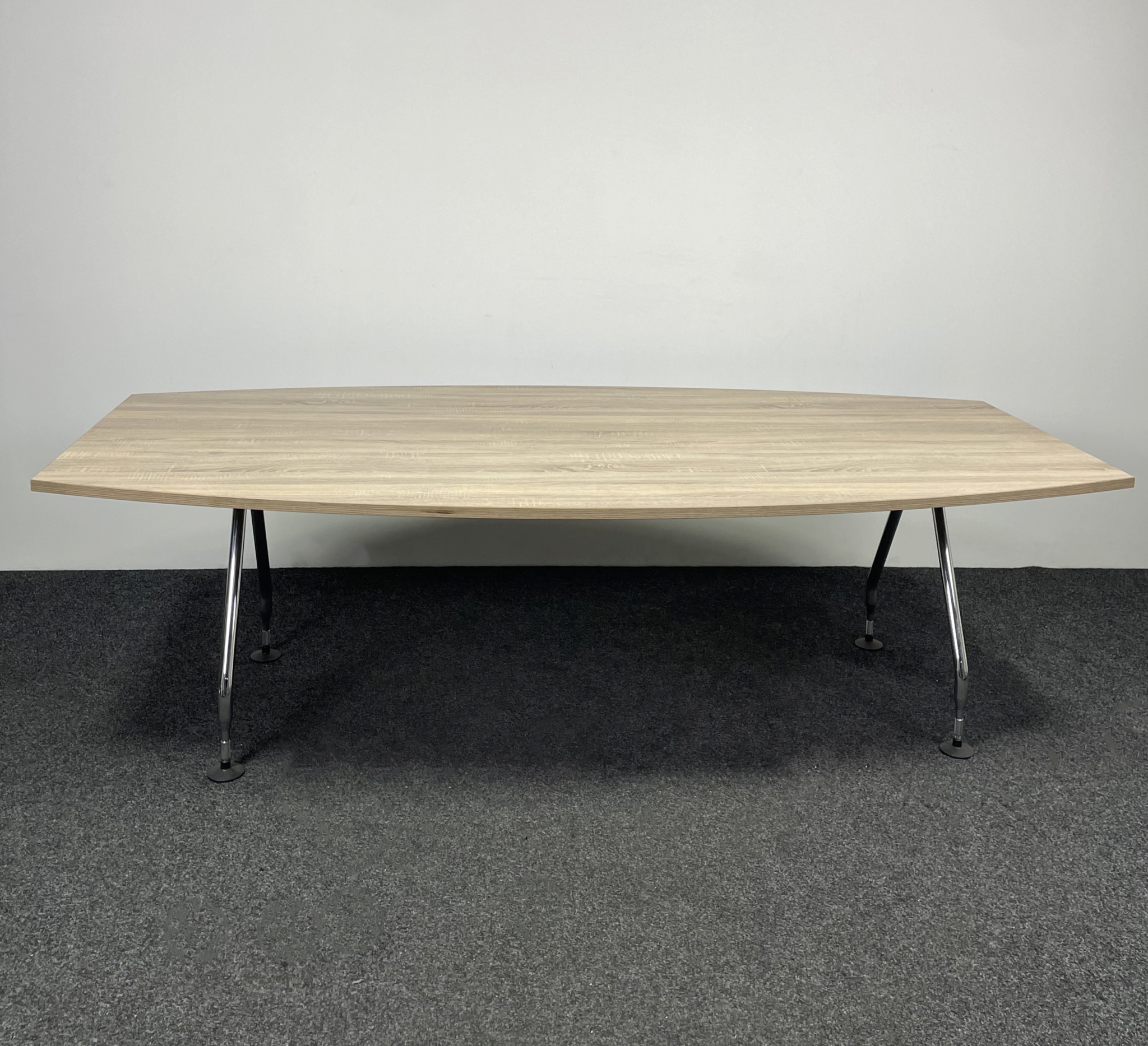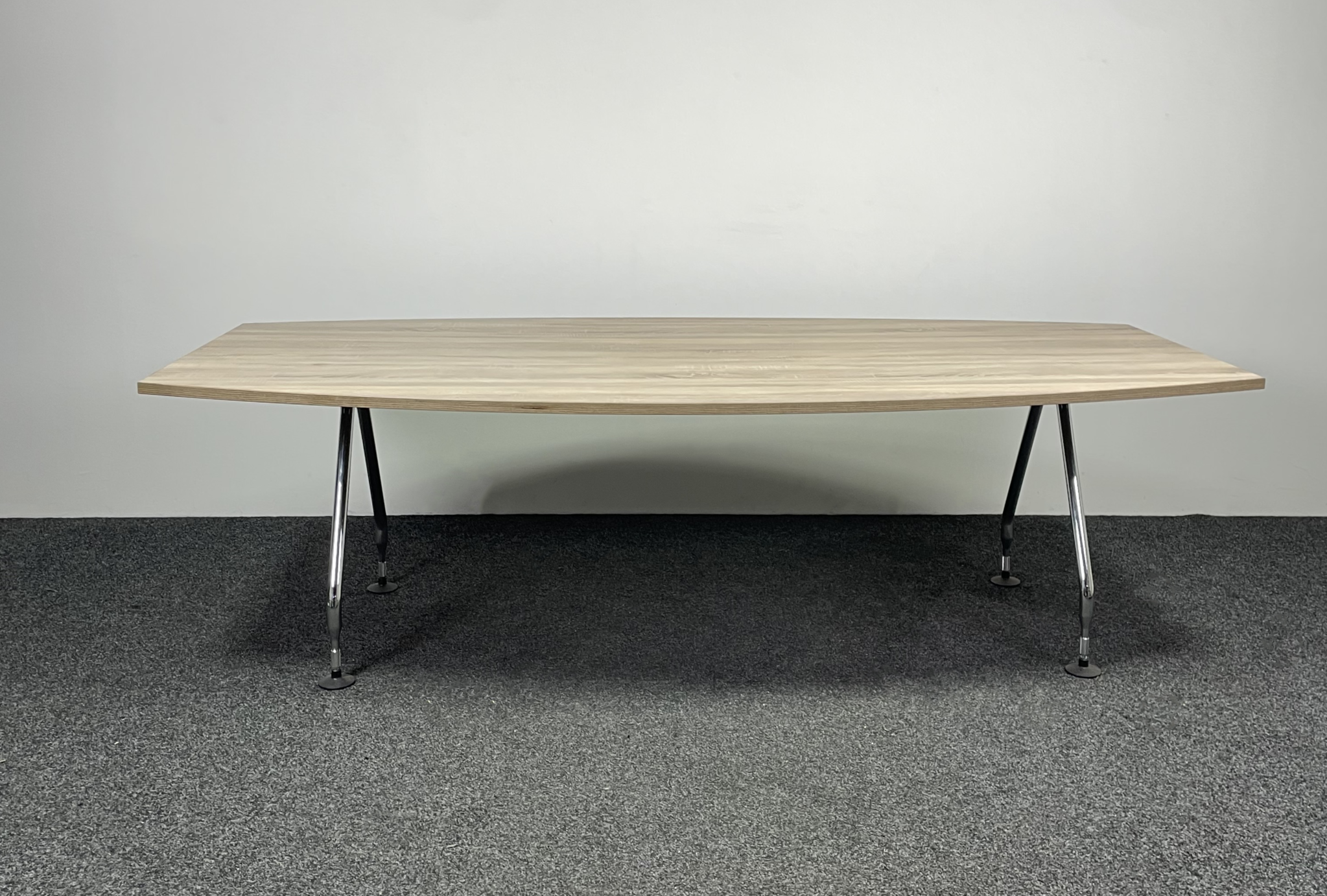 Refurbished vergadertafel van het Zwitserse merk Vitra. Deze tafel beschikt over een gebruikt onderstel en een nieuw midden eiken of wit tonvormig blad van 240 cm lang en 120 cm breed. Het onderstel is van het merk Vitra.