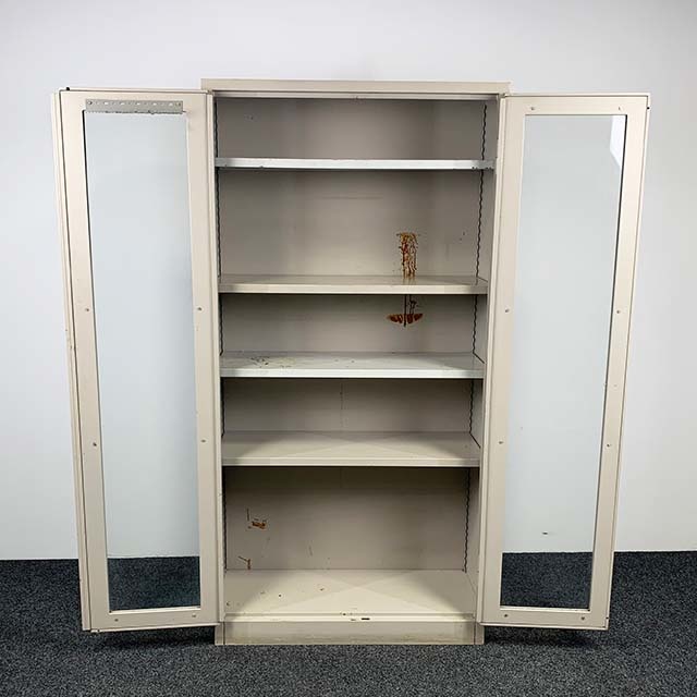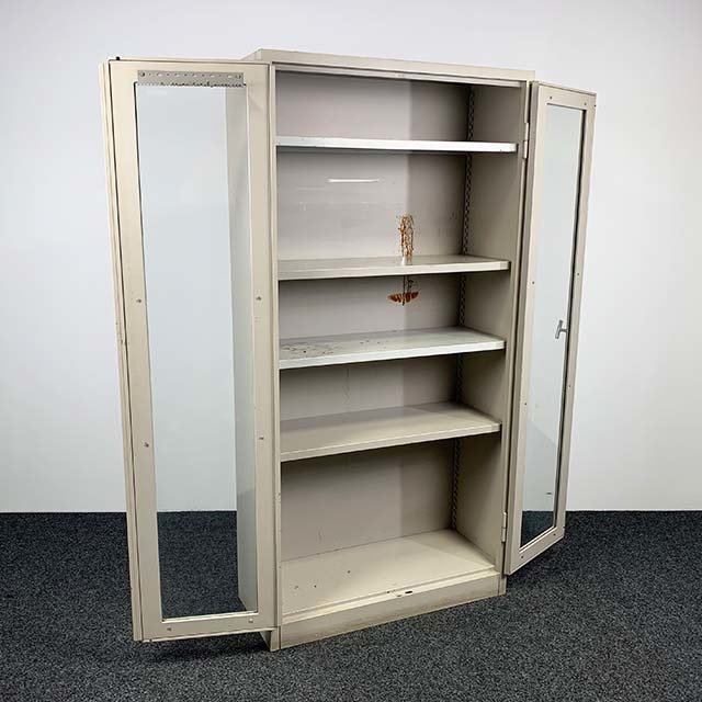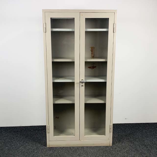 Gebruikte vitrinekast apothekerskast van metaal, in de deuren zitten glazen ramen waardoor u uw spullen kunt zien. Mooie retro vintage stalen kast.