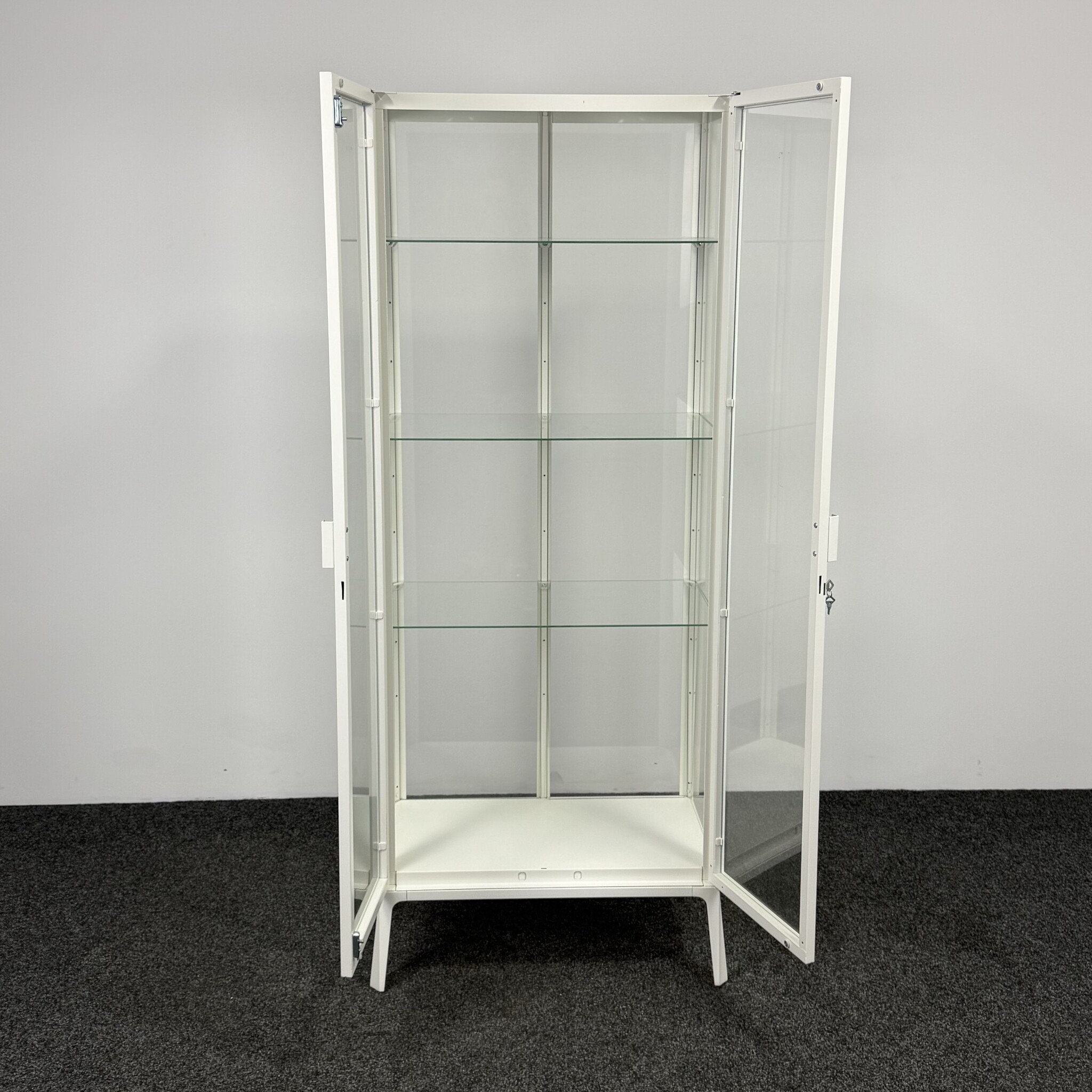 Deze witte vitrinekast met stalen ombouw is ideaal voor het stijlvol presenteren of opbergen van items. De kast heeft twee glazen deuren en drie niveaus met in hoogte verstelbare legborden. Dankzij het strakke ontwerp en de stevige constructie is deze gebruikte kast geschikt voor kantoor, showroom of ontvangstruimte.